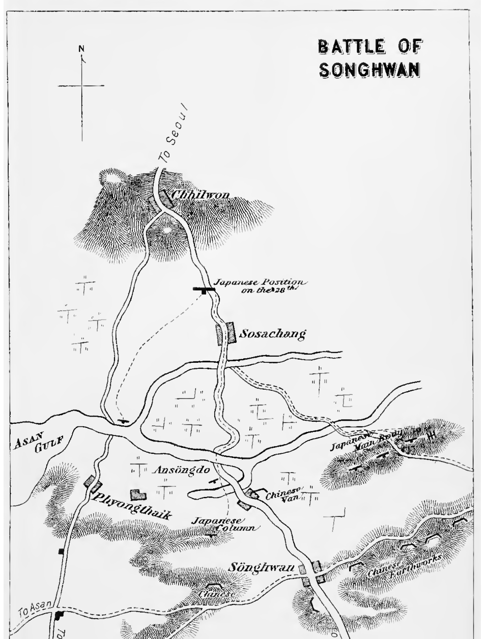 Before the Japanese troops left their encampment at Yong-san to march upon Asan, the men-of-war of Japan and China had an encounter in Corean waters, which practically opened the long-expected war though the proclamation of war was not made till a week later. About the 21 st July, China began to send more troops to Corea. Her intention was to despatch an army to Wiju, on the Corean frontier, and to reinforce those already at Asan; and the two armies were, by marching towards each other, to get the Japanese army near Seoul tactically between them. When the despatch of Chinese troops from Taku, Weihaiwei and Port Arthur was rumoured in Japan, the Japanese men-of-war Yoshino, Naniwa, and Akitsushima were sent from Sasebo on the 23rd to assertain the fact by cruising in the Corean waters. As they were on the 25th at about 7 a.m. between the islands of Phungdo and Shopaioul on their way to Chemulpo, they met two Chinese men-of-war, Kwang-yi and Tsi-yuen, which had left Asan to meet a Chinese transport. Though the Japanese regarded these vessels with anything but friendly feelings, still as active hostilities had not yet broken out, they saluted them, but the Chinese did not return the courtesy. As the sea was narrow, the Japanese men-of-war turned their course to the south-west to get into a more open sea, when they came very close to the Chinese. The latter fired upon them; and the Japanese were not slow to reply. After a sharp encounter of an hour and twenty minutes duration, the Tsi-yuen fled towards the gulf of Pechili, while the Kwang-yit in making for land, ran aground. Soon after, another Chinese warship was seen coming towards Asan with a transport flying the British flag under convoy. On the approach of the Akitsu-shima, the warship which turned out to be the Tsao-kiang, hoisted the white flag and surrendered. She was captured. Meanwhile, the Naniwa stopped the transport. On examination, she was found to be a British steamer, Kowshing, which had been chartered by the Chinese Government and was carrying over 1,100 Chinese troops and stores from Taku to Asan. The Naniwa ordered her to follow her to the Main Squadron, but Captain Galsworthy, commanding the vessel, replied that the Chinese on board prevented him and were for returning to Taku. The captain and the crew were threatened with death by the Chinese if they left the vessel. All attempts to take the ship were therefore useless as the Chinese refused to surrender; and the Naniwa therefore signalled to the captain that his crew should jump into the sea as soon as a red flag was hoisted on the warship. On seeing the red flag, therefore, the crew jumped into the sea, and were fired upon by the Chinese. They were all killed exeept the captain, the first officer, and the quartermaster who were picked up by the Naniwa's, boats. The Naniwa then sank the Kowshing with a shot which struck her engineroom. Only a few Chinese escaped by swimming to an island. Major von Hanneken, who was also on board, having been ordered by the Chinese Government to fortify Asan, also swam ashore. The Kwang-yi was found stranded by Japanese men-of-war on the 27th in a little bay to the south of Caroline Bay. Her crew had escaped in boats after exploding her powder-magazine. On the Kowshing were two Chinese Generals, fourteen field officers, and 1,100 men. The Tsao-Kiang's crew, numbering 82 in all, were brought over to Japan and are at present prisoners at Matsuyama. Captain Galsworthy and his first officer Tamplin were brought to Sasebo, but were soon released after their depositions had been taken, as also Muhlenstedt, a Danish telegraph engineer, who was on board the Tsao-Kiang. It may be here added that the Japanese Government has offered to make ample reparation for the loss of the Kowshing, which was flying the British flag, if on careful enquiry, the Japanese man-of-war should be found to have committed a breach of international law. On the 25th July, as we have said, the Japanese army left Yongsan, It consisted of the Twelfth and Twenty-first Regiments of Infantry, with the usual complement of other arms, that is, the Ninth Brigade, whose headquarters are at Hiroshima. As a corps was left to guard Yongsan and Seoul, the total strength of the army now on the march did not probably exceed 4,000. The progress of the army and the engagement at Songhwan has been described by the war correspondent of the Asahi in the following manner:— After the newspaper correspondents had received permission to accompany the army, they made instarft preparations and were ready to start, when at 10 a.m. on the 25th, they met Lieut.-Colonel Fukushima and Major Uyehara, who told them of the naval victory at Phung-do. The correspondents followed these officers to Yongsan. But when they arrived there, the army had already started though Major-General Oshima and his adjutant Major Nagaoka were still at the headquarters. The correspondents started at once, and after crossing the River Hangan at Tongjak they overtook the army. General Oshima and his staff came up soon after. At 6 p.m., the army arrived at Kwochhon, which is 7% miles from Seoul. Here the army was quartered for the night in open air. Next day, it arrived at Suwon, which is only about 10 miles from Kwochhon. On the 27th, it left Suwon at 4 a.m., and arrived at Chinwi at noon, a distance of 15 miles. At Suwon, though the Corean Government authorised the Japanese army to employ coolies and beasts of burden free of charge, the commander paid them all for their work, to the great joy of the Coreans. For the remainder of the day the troops were allowed to rest themselves on the grass, as there were no houses to accommodate them. The outposts were strictly guarded; and at 4 o’clock next morning (28th), the army began to move and soon arrived at Chhilwon, which is less than five miles distant. Here a small detachment was sent direct to Asan, while the main body marched about three miles more to Sosachang. Chinese tent