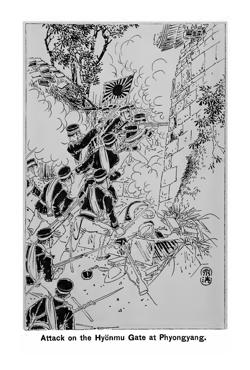 On the morning of the 15th, the Combined Brigade commenced fire on the bank of the river, and the Wonsan Column began also to fire upon the enemy from Mt. Kampak. Being thus attacked on both sides, the enemy did not know of the approach of the Sangnyong Column on the rear until it was within Soo metres. General Tatsumi, its commander, attacked the enemy’s third fort before Peony Hill; but the column was so hailed on its flank with volleys from thirteen-chambered .nagazine-rifles on the ist and 2nd forts that it was obliged to desist. The column was divided into two, one of which attacked the enemy’s right and the other the centre. Three companies were also led against the first fort, over which they climbed and bayoneted some fifty of the enemy. In this attack, the captains of the three companies were severely wounded; but the fort was captured at 7.30. One of the two sub-divisions of the column next carried the third fort at 8.0. The Wonsan Column, meanwhile, attacked the enemy’s left, and a battalion, suddenly descending upon the Wiju road, took by storm the left fort. Soon after, the second, fourth, and fifth forts before Peony Hill fell. The Wonsan and Sangnyong Columns next attacked Peony Hill from three sides with such effect that the enemy were utterly swept out of it. After the capture of this important position, Colonel Sato of the Wonsan Column attacked the Hyon-mu Gate of the city which fell after three assaults. The enemy’s cannon sounded less and less; and the Japanese columns, also being fatigued, rested at 2 p.m. At midnight of the 14th, the Main Division arrived at Sanchondong, and at daybreak saw the enemy waiting for its advance at their earthworks. The Japanese Artillery occupied a hill opposite to the earthworks at Oison and fired upon them, and the enemy replied with equal energy. An Infantry company then descended the hill and marched through a sesame field. About 100 horsemen of the enemy approached the company without its knowledge; but the Artillery, seeing the danger, fired upon them. The company then became aware of the horsemen’s approach, and fired upon them. A majority were killed, and seven or eight were taken prisoners, who confessed on examination that the men on the north side of the city were disheartened Attack on the Hyonmu Gate at Phyongyang. at the death of their General Tso-Paokwei, whose bodyguard and cavalry had already taken to flight. A little after, about 40 of the enemy’s cavalry were seen to flee by a stream behind Oison; these too were attacked, and only one escaped. Major Okuyama had by their time set fire to the enemy’s camp and entered the city. The Oison earthworks were also stormed at almost the same time, taken, and burnt down. The Combined Brigade was so successful in drawing out the enemy that the latter were taken by surprise when they were attacked in other quarters. The enemy’s forts, each 16 feet high, at Songkyori, were attacked; but they defended themselves with such energy under Generals Yeh and Ma that loss was heavy on both sides. The Japanese lost over 20 officers killed. The earthworks were taken after a severe fight. The forts were next attacked, but the enemy’s Mausers, with their thirteen chambers, were irresistible, the Japanese rifles being single. Two companies in the centre having exhausted their ammunition and lost their officers, showed a disposition to retreat, when the adjutant Major Nagaoka, rushed at their head and encouraged them. They soon regained their ground. General Oshima, who was standing about 70 metres behind the van also rushed forward some 40 metres and commanded the nth Reginent. The officers tried to persuade him to retire to a place of safety; but he refused, saying he would die under the standard. The troops were encouraged by their leaders’ example. And at last at 2.30, they gained possession of the forts, after fighting for nearly ten hours. The severity of this fight was due to the difficulty of getting a good position for the artillery, which was at the time 1,400 metres from the forts and was therefore comparatively ineffectual. At 4.30, the Chinese hoisted the white flag. General Tatsumi sent an aide-de-camp, and the enemy said that as it was raining heavily and night was coming on it would be difficult to examine their troops, and asked the Japanese to allow them time until the following morning to make preparations for capitulation. The request was granted; but that evening, the Chinese made preparations for flight. At 8.0, they left the city, some through the gates in companies, others jumping over the wall, and made for the coast and Wiju roads. They were attacked; but they made themselves into squares and defended themselves in their flight. Over 300 were founded dead next morning on the coast road and 200 on the Wiju. The Chinese attacked the Red Cross Society’s Field Hospital and committed outrages on the defenceless sick. The South-west Gate, facing the river, was captured at 7 p.m., the few Chinese guards being dispersed. The second gate was taken soon after, though the Chinese threw stones to prevent the advance of the Japanese. Early next morning, the whole army entered the city. The Chinese left behind about 2,000 dead, and their wounded are believed to have been at least double that number. Many bodies were found dead on the road. About 700 prisoners were taken, of whom 17 were Coreans. Of the Chinese, 25 died of their wounds and 47 were killed for attempting to escape. Altogether 37 guns and 1,160 rifles were captured with large quantities of ammunition and provisions. The Japanese losses were as follows :—