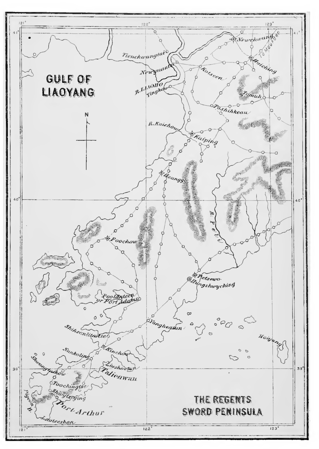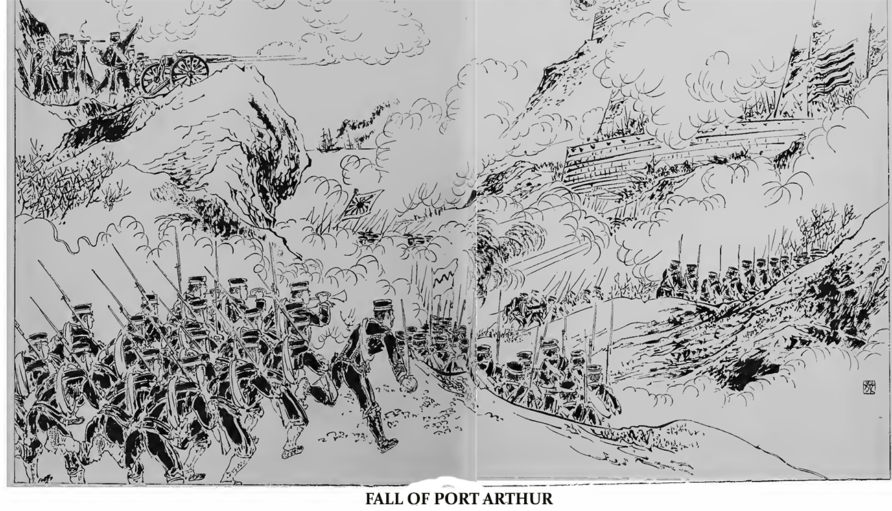 The first fleet of transports left Ujina, the port of Hiroshima, between the 16th and 18 th, followed by two more fleets, and arrived at Oeundong, at the mouth of the Taidong, in Corea. On the 24th, a fleet of over 50 transports left that place under convoy of men-of-war. Hwayuankow, a little village at the mouth of the River Hwayuan, was chosen for landing as though Petsewo, a town of some importance further west, would have been preferable in many respects, the beach was muddy and extended too far out for landing. Petsewo is about 60 miles from Kinchow. Marines from the Chiyoda first landed and, after taking possession of the shore, were followed by the army. The troops which had left Ujina by the 18th were all landed at Hwayuankow by the 28th. The landing of horses, however, occupied twelve days. On the 25th, the advance guard which had landed early that morning left Hwayuankow. The First Battalion of the First Regiment, Infantry, under Major Saito, arrived the next day at Petsewo, which was occupied, without any resistance. The First Division reached that town on the 29th and the Commander-in-chief on the 4th November. On the 2nd, Major Saito was sent with a battalion each of Infantry and Engineers towards Kinchow to make a reconnaissance. The First Division left Petsewo onthe 3rd and reached Hwangheateen, 25 miles from that town, on the 4th. Major Saito met on the same day a company of Chinese at Lluheateen, whence, after a sharp encounter, the Chinese fled? leaving behind provisions and ammunition. On the 5th, when the Division had gone some three miles from Hwangheateen, the Chinese began to fire upon the advance-guard from the batteries at Mt. Tahoshang, which was about. 6,000 metres from the army. Lieut.-General Yamaji then made a forced march over 25 miles through hilly road to Kanheatun with two regiments with the object of attacking the Chinese rear as he had found that the Foochow road was quite unguarded. Major-General Nogi was left with an I.ifantry regiment and an Artillery corps to attack the batteries at Tahoshang, while Colonel Kono, with another regiment, the 15 th, was to advance against the enemy’s left from the Petsewo road. Next day, the 6th, having been fixed for the attack on Kinchow, the regiments left their encampments at 4 a.m. Major Saito, of the 15 th Regiment, led his battalion around the right flank of the forts at Tahoshang to the rear. A company of that battalion clambering up a precipice, charged upon the first battery, of which, in spite of a stout resistance, it soon took possession. With the aid of a second company, the same company also occupied the second battery. The fugitive Chinese were pursued to Kinchow. Lieut.-General Yamaji had, in the meanwhile, advanced along the Foochow road, while Major-General Nogi and Colonel Kono also closed upon Kinchow. Simultaneously with the latter, the Second Regiment, one of the Main Division, opened fire upon the castle. For fifty minutes the Chinese replied with their Krupp guns, but after that, showed a disposition to retreat. As the castle walls were 30 feet high, the Engineers destroyed with gun-cotton the North gate which was the strongest of all; and through the breach the Japanese rushed in. The East gate was also broken open. The Chinese then opened the West gate and fled along the Port Arthur road, pursued by the Japanese as far as Sooheatup. The castle fell at 10 a.m. Major-General Nogi and Colonel Kono were then sent with their regiments against Talienwan. When they arrived at the forts early on the morning of the 7th, they found them deserted. All the forts, magazines, and the torpedoLstation fell into their hands. The total strength of the garrison at Kinchow was about 1,500 while there were at Talienwan over 5,000 who, however, took to their heels as soon as they heard of the capture of Kinchow by the Japanese on the 6th; the Chinese lost a small number in killed, and 100 wounded, while among the Japanese a lieutenant and a few privates were wounded at Kinchow. On the 7th, the Japanese fleet came to the Bay of Talienwan to assist the army; but when they arrived, the fortress had already beeen taken. Talienwan is a naval port next in importance to Port Arthur and Wei-hai-wei. There are three forts on Hoshang-tao, which juts out in the middle of the Bay. The central fort has 2 21-c.m. and 2 15-c.m. guns, while the east and west forts have 2 24-c.m. guns. The Laokewtow fort, lying to the west of Hoshang, has 2 24 c.m. and 2 21 c.m. guns; the Hwangshan, S. W. of Laokewtow, possesses 2 24-c.m. and 2 12-c.m. guns ; and the Seuheashan fort, N.E. of Hoshang, is furnished with 4 15-c.m. guns. The capture of Kinchow and Talienwan had been effected by the First Provincial Division alone. After these victories, the army took up its headquarters at Kinchow where a Civil Administrative Office was opened. On the 13th, Major-General Hasegawa arrived at Kinchow at the head of the 12th or Combined Brigade. On the i6tb, the Army encamped outside the city, and on the following day, commenced the march upon Port Arthur. The Army advanced in two columns. The right column consisted of the Independent Cavalry, the First Provincial Division Infantry (except two battalions of the 15th Regiment), the 12th (Combined) Brigade (except such as were included in the left column), and the Siege Artillery Train. The column marched from Kinchow via Sanshih-lipu and Shwangtai-kow. The left ( 58 ) column consisted of the 14th Infantry Regiment (except a battalion which remained at Liushootun), a sub-company each of Cavalry and Engineers, and half a Medical Corps. This column under the command of Lieut.-Colonel Masumitsu passed through Tsintseling to the north-east of Port Arthur. A battalion of Cavalry went as an independent body to reconnoitre the enemy. On the 18th, at 10 a.m., when it arrived at Seuheatun, it fell in with thousands of the enemy’s cavalry and infantry who came from the neighbourhood of the Shwytseying, and foug