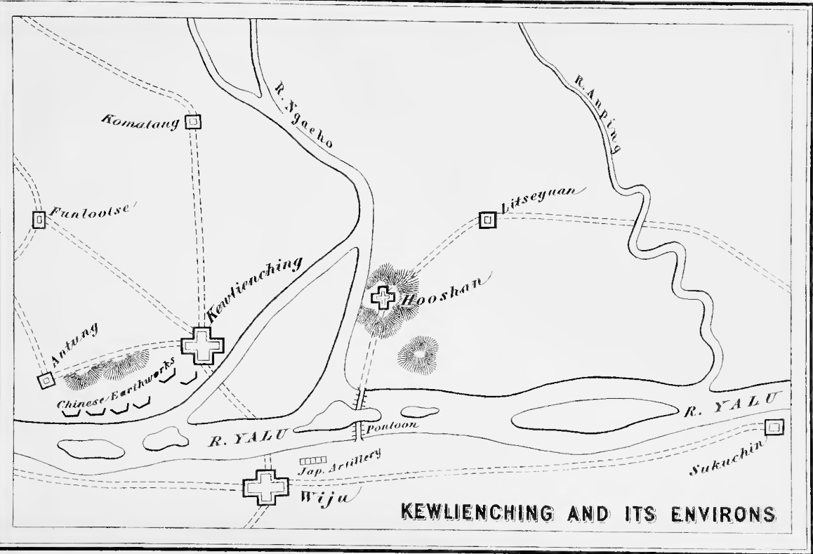 The column reached Sukchhon on the 25th and Anju on the 27th, at the latter of which it remained until the 5th to complete the line of communications from Phyongyang. Outside Anju across the road to Wiju runs the River Chhong-chhon, where the Chinese had thrown up earthworks to oppose the advance of the Japanese army. But when the Engineers of the column constructed a pontoon across the river, the Chinese deserted these earthworks and made a hasty retreat. On crossing the river, the road divides into two, the main road to Wiju and the other to Kusong. The column reached Kasan on the same day. The Chinese had burnt the towns as they passed through them in their retreat; and Kasan was in ruins. On this day, the main body of the Fifth Provincial Division arrived at Sukchhon, while the report was received on that day from the advance cavalry which had reached the Yalu. From them it was ascertained that the Chinese had retreated across the river and had thrown up earthworks on its tight bank from Antung to a point opposite to Wiju. On the column’s arrival at Chonju on the 6th it was at first decided to make this town a depot of supplies as it is nearly half-way between Phyongyang and Wiju, but the project was abandoned as the entrance to Pogan, at the mouth of the River Chhong-chhon, was too shallow to admit of the approach of transports. Kwiyong, therefore, on the coast between Chholsan and Yongchhon, was made a depot instead. After reaching Sonchhon on the 7th and leaving it on the 9th, the column Game to Chhonggan, where the road to the left passes through Chholsan to Kwiyong; but the column marched on the main road, and arrived on the 10th at Sokotkwan, which was made the headquarters of the Brigade, as it was within an easy reach of the castle of Paingmasan, which commanded Wiju and the country across the Yalu. On the 17th, the Tenth Brigade took possession of Wiju. The Chinese were seen to make great preparations for defending the frontier, but General Tatsumi was obliged to wait till the arrival of the rest of the First Army as Marshal Yamagata had strictly forbidden desultory fighting. A column of the Third Division, which had left Sukchhon on the 4th, after passing through Anju, took the road to Kusong from the River Chhong-chhon, and advancing from Kusong to Wiju, was joined on the road by a detachment of the Tenth Brigade, which had been sent to reconnoitre up the River Yalu for the most suitable place for crossing it. Another column of the Third Brigade, under Colonel Sato, also took the road to Kusong and advanced to Sakin, near Chhongsdng. Marshal Yamagata and his Staff- arrived at Wiju on the 23rd. The Chinese at Phyongyang had been defeated in a single day though they had boasted that they could hold out for three years. They began to throw up earthworks at Anju on the River Chhong-chhon; but on the Japanese flying column coming up, they threw away their arms and provisions, and fled to Kasan. There too they failed to make a stand, and divesting themselves of their uniforms, they escaped to Wiju. But as Wiju is a small castle, they resolved to make their final stand at Kewlienching, on the Chinese bank of the Yalu. The Mingtse Troops from Taliehwan and the Lutai Trained Troops who had been brought to Tatungkow under the convoy of the Peiyang Squadron, refused to enter Corea when they heard of the Japanese victory at Phyongyang which they were to have reinforced, while their return to their garrisons was cut off by the defeat of the warships which had convoyed them. These, therefore, joined the Phyongyang fugitives at Kewlien-ching to prevent the Japanese invasion of China. The commander of the Chinese forces at Kewlienching was Sungkiang, who, having studied the military science in Europe, was reckoned a great general by his countrymen. His troops were more or less trained. Their strength was about 21,000. During the forty days that Sung-kiang had been at Kewlienching, he had strengthened the castle. He had fortified the bank from Sukuchin to Antung, while a strong wall was built in front of Kewlienching, with independent forts. From Kewlienching to Hooshan and Litseyuan, there were forty-three redoubts, three or four metres high, of sufficient thickness to resist ordinary shot and with deep trenches. On eminences behind them were built forts commanding the approaches. Kewlienching has ranges of mountains behind it while on the south-east flows the Yalu, and the Ngaeho on the north-east; and facing it across the Ngaeho stands Hooshan, an eminence of strategic importance. The Chinese had taken possession of this hill; and unless they were dislodged from this position, it would be disadvantageous to attempt to storm Kewlienching. But as Hooshan was well-fortified on front, Marshal Yamagata decided to attack it on the flank and rear. Accordingly, Colonel Sato, of the 18th Regiment, who was in command of two battalions of that regiment with a small company of Cavalry and Artillery, was ordered on the 23rd to cross the Yalu at Sukuchin, about 7'1/2miles up-stream from Wiju. On the 24th, at 11 a.m., Colonel Sato’s column forded the river at a point two miles up-stream from Sukuchin. Chinese troops were on the opposite bank at the mouth of the River Anping, where guns had been set, and began to fire upon the Japanese. But the latter still advanced, and when they were about 600 metres from the enemy, the Chinese fled from the guns. They consisted of 300 Chuntse Troops and 60 Amour horsemen. They left behind two guns, fourteen rifles, and over 400 tents besides articles of clothing, which all fell into Japanese hands. Colonel Sato successfully crossed the river with only one man wounded, while the Chinese lost 20 killed or wounded. The Yalu is one of the five great rivers of Corea. It is divided into three streams. Though it is not very deep, the weather being cold, it was difficult to wade across it, nor were there boats enough to carry the troops. The Staff Headquarters, therefor