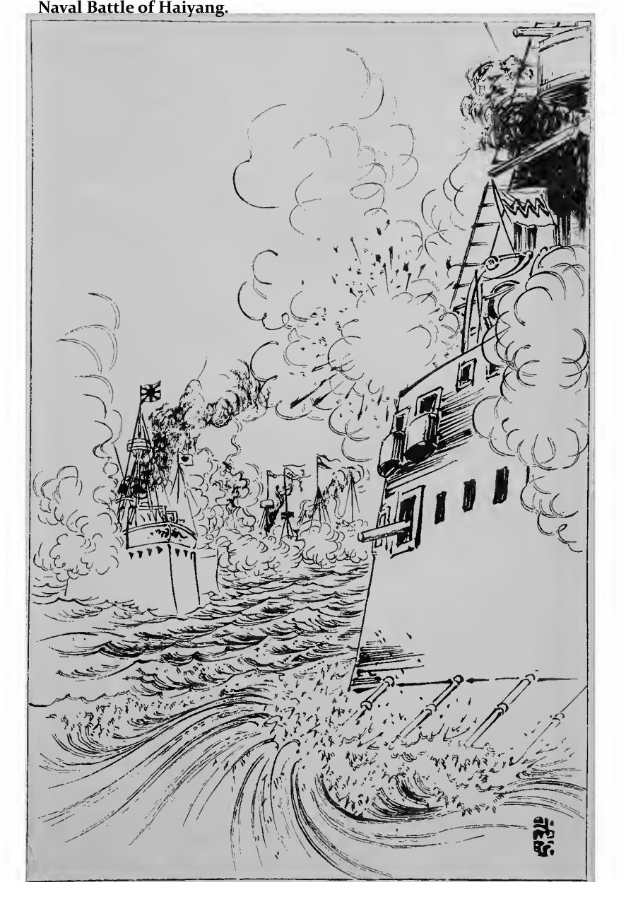 The Japanese Navy had done little more than reconnoitre Chinese coasts, convoy Japanese transports to Corea, and jealously watch for the appearance of the Chinese fleet in Corean waters, ever since the engagement off Phungdo on the 25th July. For nearly two months little or nothing was heaifd of its whereabouts or movements. The very silence gave rise at one time to all sorts of sinister rumours and surmises. Only once, on the loth August, was it seen off Wei-hai-wei, when that naval port was fired at, and that too was a mere ruse on its part. The comparative strength, therefore, of the two navies was yet unknown, though in the matter of mere numerical strength the Chinese Squadron had a decided superiority. But the Japanese had the advantage with regard to its equipment. The mastery of the Corean sea was still disputed; and until the two navies could come to a decisive issue, the belligerent powers could only send their transports to Corea under a strict convoy and always keeping well to the shore. And this decisive issue it was that was brought to a head on the 17th September. The Japanese forces were slowly but surely closing upon the Chinese garrison at Phyongyang. The Chinese generals at Phyongyang, though jealous of one another, appear all to have relied upon numerical superiority for victory. None of them sent scouts to ascertain the movements of their enemy, whom, had they been alert, they could have seriously harassed by a well-concerted plan of successive attacks upon their interior lines. But the Chinese did nothing of the sort; and when they were not rejoicing at victories over Japanese reconnoitring parties, they called for the despatch of more troops, although, being a thousand or so inferior in strength to the attacking army, they could have easily held out against them in their well-fortified position. About the 14th September, therefore, Li-Hung-chang sent at their urgent request reinforcements of 4,000 men together with stores and provisions in five transports from Taku. These vessels which were met by six cruisers and four torpedo-boats in Pechili Gulf, made under their convoy for Tatungkow. At Talienwan, they were joined by eight other men-of-war including the battleships Ting-yuen and Chen-yuen. On the 16th, they reached Tatungkow, where the men and stores were landed. These troops, it may be added, were, on the fall of Phyongyang becoming known, sent to Kewlienching, whence they fled on the 24th October when that stronghold was attacked by the Japanese. The Chinese warships remained at anchor until the 17th, when a cloud of black smoke was seen in the south, and seeing the approach of the Japanese Squadron; Admiral Ting ordered his ships to prepare for battle. The Chinese weighed anchor and advanced towards the Japanese in a wedge formation, the two ironclads in the centre leading the fleet, the vessels of which were ranged on either side in the order of their size. The transports went up the Yalu River for safety. On the 14th September, the Japanese Squadrons convoyed thirty transports to Caroline Bay, where the Third Flying Squadron, consisting of six smaller vessels of the navy, was left to cover the landing of the troops. The rest of the fleet made for the Taidong River, which they reached on the following day, and here too four minor vessels were sent up the river to cover the army, if necessary, in crossing the river in the attack that had already commenced upon Phyongyang. On the 16th, the remaining warships, that is, the Main Squadron, the First Flying Squadron, the Gun-boat Akagi, and the Merchant-cruiser Saikyo, turned their course towards Haiyang Island, where they expected to meet the enemy’s fleet. The torpedo-flotilla which had accompanied them to the Taidong had gone up the river, and they did not wait for their return before starting for the opposite shore of the Yellow Sea. On the morning of the 17th, the two squadrons arrived at Haiyang; and as no Chinese warship was to be seen about the island, the squadrons made for Talu Island, off Takushan. At 11.40 a.m., the Chinese fleet came into sight and was advening towards them. The Akagi and the Saikyo, not being fighting ships, were ordered to get under cover of the squadrons. At noon, just before the battle was commenced, the Japanese flqet was 12 miles to the N.E. by N. of Talu Island. The Flying Squadron, consisting of the Yoshino, Takachiho, Naniwa, and Akitsushima, first advanced to attack the Chinese right, followed by the Main Squadron, which comprised the Matsushima, Itsukuskima, Hashidate, Chiyoda, Fuso, and Hiyei. The Chinese fleet consisted of the Ting-yuen and Chen-yuen in the centre, followed on either side and a little to the rear by the King-yuen and Chih-yuen, outside them the Lai-yuen and Chinq-yuen, then the Yang-wei and Tsi-yuen flanking them, and outermost of all the Chao-yung and Kwang-chia. The Kwang-ping and Ping-yuen remained outside the line. At 12.45, the Chinese opened fire at 6,000 metres, but the Flying Squadron did not reply until it was within 3,000 metres. The two vessels on the extreme right of the Chinese Squadron, which were the Chao-yung and Yang-wei were attacked by the squadron, being the nearest to it, and they were separated from the fleet. The Flying Squadron continued to attack them until it was 1,600 metres from them. The Chao-yung caught fire and sank. As the Main Squadron advanced at the rate of ten knots an hour, the Hiyei, which could not keep up that speed, was soon left behind, followed closely by the Fuso; and when the Chinese saw the Hiyei lagging behind, the Ting-yuen and Ping-yuen poured broadsides into her; but these two assailants were too close together and had to desist from firing for fear of hitting each other. The Hiyei, finding herself at such close quarters, boldly advanced between the Ting-yuen and King-yuen and passing through the Chinese line, rejoined the Main Squadron. Two torpedoes were discharged at her, but missed their mark; a she