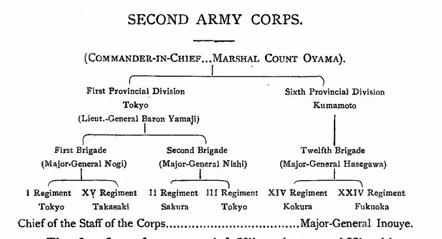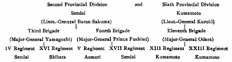 The Chinese had been utterly defeated at Phyongyang on the 15th September and finally driven out of Corea by the battle of Kewlienching on the 24th October; and the Japanese army next invaded Chinese territory. As the First Army Corps drove them from castle to castle in Manchuria, it was necessary to strike a decisive blow by the capture of the great Chinese fortress and naval station of Port Arthur. Such a victory would place the whole of Pechili Gulf in Japanese hands. And to this end, the Second Army Corps was organised and despatched to the Regent’s Sword. This Second Army was to be composed of the First Provincial Division and the Twelfth Brigade, wjkich belongs to the Sixth Provincial Division. The First Division, whose headquarters are at Tokyo, reached Hiroshima on the 27th September, Marshal Oyama having been appointed its Commander-in-chief on the preceding day. On the 15 th October, the transports were ready to take the army over to the Regent’s Sword. The Japanese Diet held at the time an extraordinary session at which a war budget of 150,000,000 yen was unanimously voted. The Sixth Brigade under Major-General Hasegawa had already left for Corea, whence it was afterwards re-transported to China. The army was constituted in the following manner:—