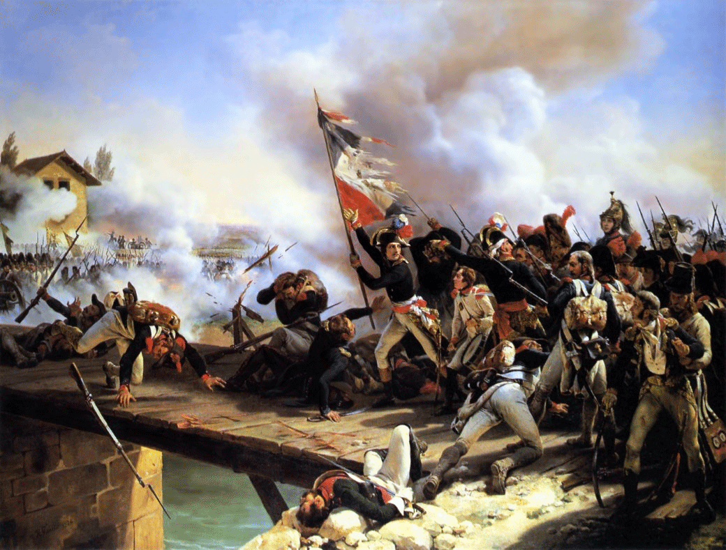 Bonaparte plaça Masséna sur la digue de gauche pour remonter sur Gombione et Porcil, et prendre l'ennemi en queue, s'il marchait sur Vérone. Il dirigea Augereau à droite pour déboucher sur Villa-Nova. On était à la pointe du jour. Masséna se mit en observation sur la digue de gauche; Augereau, pour parcourir celle de droite, avait à franchir l'Alpon sur le pont d'Arcole. Quelques bataillons croates s'y trouvaient détachés pour surveiller le pays. Ils bordaient la rivière, et avaient leur canon braqué sur le pont. Ils accueillirent l'avant-garde d'Augereau par une vive fusillade, et la forcèrent à se replier. Augereau accourut et ramena ses troupes en avant; mais le feu du pont et de la rive opposée les arrêta de nouveau. Il fut obligé de céder devant cet obstacle, et de faire halte.