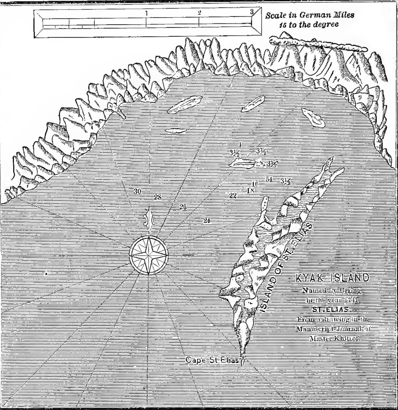 the evening of the 20th they came upon an island in 59° 40', which was Kyak, but which they called St Elias from the day.