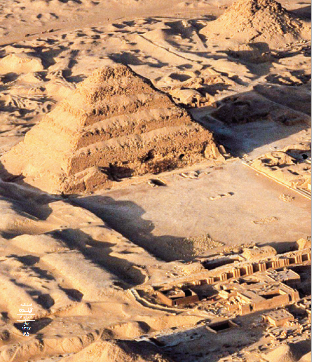 In all probability Zoser himself never used this tomb, built so near those of his ancestors; but assisted by Imhotep undertook the construction of a mausoleum on a more ambitious plan than any of his ancestors had ever attempted. In the desert behind Memphis he laid out a tomb, very much like that at Bet Khallaf, but the mastaba was now built of stone; it was nearly thirty eight feet high, some two hundred and twenty seven feet wide, and an uncertain amount longer from north to south. As his reign continued he enlarged it upon the ground, and increased its height also by building five rectangular additions superimposed upon its top, each smaller than its predecessor. The result was a terraced structure, one hundred and ninety five feet high, in six stages, the whole roughly resembling a pyramid. It is often called the “terraced pyramid”, and does indeed constitute the transitional form between the flat-topped rectangular superstructure or mastaba first built by Zoser at Bet Khallaf and the pyramid of his successors, which immediately followed.