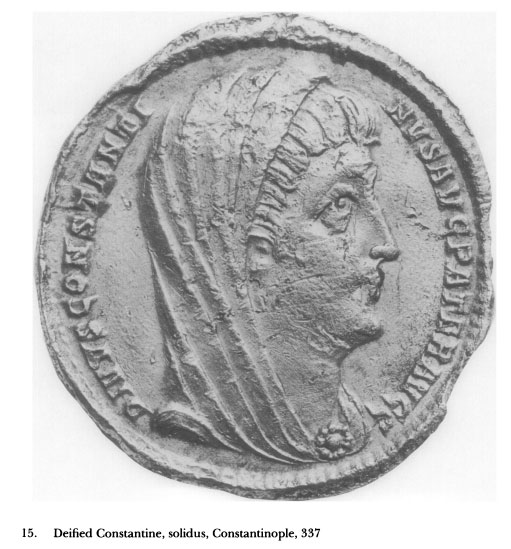 in 336/7 (Fig. 16) or in the posthumous coin of Divus Constantinus struck in Constantinople shortly after