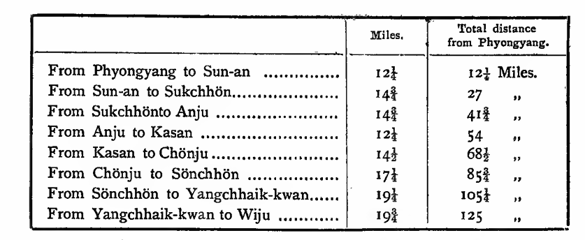 With their complements of the Cavalry, Artillery, Engineers, and Commissariat. Commander of the Field Artillery.........Major-General Kuroda. Chief of the Staff of the Corps...............Major-General Ogawa. On the 24th, a column of the Tenth Brigade under General Tatsumi left Phyongyang for Wiju, on the Corean frontier. On that day Sun-an was reached. The distances on the main road to Wiju are as follows : —