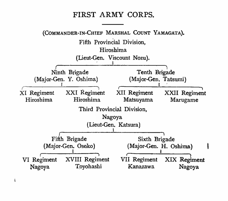 After the utter rout of the Chinese army at Phyongyaug, the Japanese army took up temporary quarters at that city, as its intention was next to drive the Chinese out of Corea. On the 17th September, a flying column was sent after the fugitive Chinese. Marshal Yamagata, who had been appointed Commander-in-Chief of this army, which is called the First Army Corps to distinguish from the others, arrived at Phyongyang on the 25 th September followed soon after by Lieut.-General Katsura, Commander of the Third Provincial division. The First Army Corps was now fully organised in the following manner.