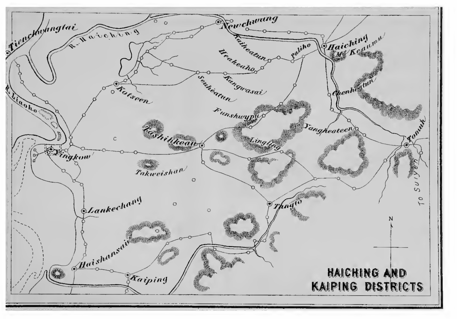 The First Army Corps’ operations in Manchuria were carried on in two different directions, the former being the movements of Major-General Tatsumi’s Column on the Moukden road, and the latter those of the Third Provincial Division in the Tomuh and Haiching district. These were supplemented by those of the Second Army Corps which advanced from Kinchow on the Kaiping road. Let us first follow the movements of the Tatsumi Column. There are two roads from Funghwangching to Moukden, one running northward to Tsaoho-kow whence it turns westward to Liaoyang, and the other running in a north-easterly direction to Ngaeyang-peenmun, whence it veers towards Liaoyang. Major General Tatsumi, who had made Funghwangching his headquarters on the 30th October, received a report that Chinese troops were to be seen about Lienshankwan in great strength. On the 10th November, he sent mounted scouts thither, followed by an Infantry battalion under Major Imada. The scouts met a Chinese detachment near Lienshankwan, and routing it, took possession of Lienshankwan. Major Imada entered the place soon after. The Chinese retreated to Motienling. Major-General Tatsumi also sent on the 9th November mounted scouts on the Kirin road, followed by a battalion under Captain Adachi, who reached on the 13th Ngaeyang-peenmun, 30 miles from Funghwangching. Before he could thence arrive at Saematsae he was beset by 1,800 Chinese, of whom 300 were horse. As he was outnumbered by nearly one to ten, he took his position on a hill and replied vigorously to their fire. After three hours’ fight, it became dark, and the captain began to retreat, as he had performed his proper duty of reconnoitring the enemy’s position. He had also sent a horseman beforehand with a report to Major-General Tatsumi; and the General immediately despatched Captain Hirai with a company, who succeeded in covering his retreat. Learning that Major Imada’s body might be too small to hold Lienshankwan, Major-General Tatsumi sent a battalion, under Lieut.-Colonel Tomioka, Commander of the 22nd Regiment. From Lienshankwan, Lieut.-Colonel Tomioka sent a company under Captain Kato to reconnoitre Saematsae; but atTsaohokow, the captain was confronted by 1,500 Chinese. He retreated to Tungyuenpu. On receiving the captain’s report, Lieut.-Colonel Tomioka left Lienshankwan as he might at any time be attacked On both sides, and arrived at Tsaohokow on the 25th. The Chinese were reinforced, and they now numbered 4,000 infantry, and 1,000 cavalry, with six guns. They were Kirin and Amour troops under General E-kuei-tang-o, of Amour District. They communicated with the Chinese who had retreated to Motienling ; and 1,000 each, of infantry and cavalry, with two guns, advanced past Lienshankwan to Fungshwyling. Their total forces were three times the Japanese. A battalion was pitted against the Amour troops, while the Motienling troops were kept at bay by two companies. Two captains and a lieutenant were wounded ; but they fought desperately. The Japanese made a brave stand against odds, but they lost over forty in wounded or killed. The engagement was brought to a close by a heavy snowfall. At night, the rifles were frozen, so that the Japanese were compelled to light fires to warm them. On the following day, the enemy had retreated out of range. Major-General Tatsumi sent a battalion again towards Ngaeyang. He received a report soon after that Colonel Nishi-jima of the nth Regiment, had routed the enemy at Kwanteen 011 the 23rd and was marching upon Saematsae. On the 26th, therefore, the Major-General left Funghwangching to combine with the Colonel in the attack upon Saematsae. On the 29th, he was close upon that town, when a horseman came to report that Lieut.-Colonel Tomioka was again hard-pressed about two miles from Tsaoho Castle ; and as, soon after, Colonel Nishijima reported the capture of Saematsae, lie turned eastward and reached Tsaoho Castle in the evening. A junction was formed with Lieut.-Colonel Tomioka. On the following day, a battalion was sent against the Chinese who had taken up a position near Tsuy-heafang. The Chinese, on being dislodged from one hill, immediately fled to the next and began firing as before. After three hours’ fighting, evening fell and the Japanese troops lit fires at Tsuyheafang. In the night, the enemy took to flight. The Japanese lost six men wounded, while the total Chinese loss is estimated at 200 killed or wounded. As the Chinese troops could not be seen for more than eight miles from Tsuyheafang, Major-General Tatsumi resolved to return to Funghwangching, which he reached on the 5 th December. As soon as Major-General Tatsumi had returned to his headquarters, the Chinese again advanced. They marched in two columns, one along the Kirin road and the other along the Liao-yang, with the object of closing upon Funghwangching. MajorGeneral Tatsumi, therefore, left the castle on the 9th December, and arrived that day at Seueliteen, 12'5 miles on the road to Mo-tienling. The General’s intention in taking this road was to hold the Chinese troops about Motienling in check so as to facilitate the march of the Third Provincial Division upon Haiching. On the 10th, he came to Fanheatai, 10 miles from Seueliteen, where he met the Amour General E at the head of 3,000 men. Fanheatai is in a valley from 1,200 to 2,000 metres wide, with mountains on both side, and a river flowing close by the village. The Chinese wings, consisting of about 600 men each, had taken up their positions on both mountains, while the centre was stationed between the river and village. They had two guns which they fired with smokeless powder. A Japanese battalion advanced along each mountain and fired upon the enemy’s wing on the other. After a few hours’ desultory fighting, a battalion under Major Imada extended into a double line, about 1,600 metres long, and bore down upon the enemy’s centre, which was utterly routed. The Chinese wings, being thus d