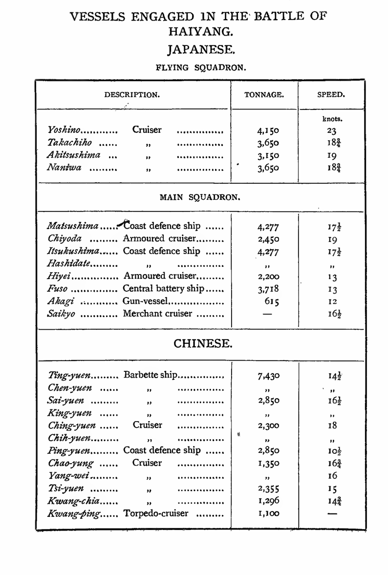 The Japanese Navy had done little more than reconnoitre Chinese coasts, convoy Japanese transports to Corea, and jealously watch for the appearance of the Chinese fleet in Corean waters, ever since the engagement off Phungdo on the 25th July. For nearly two months little or nothing was heaifd of its whereabouts or movements. The very silence gave rise at one time to all sorts of sinister rumours and surmises. Only once, on the loth August, was it seen off Wei-hai-wei, when that naval port was fired at, and that too was a mere ruse on its part. The comparative strength, therefore, of the two navies was yet unknown, though in the matter of mere numerical strength the Chinese Squadron had a decided superiority. But the Japanese had the advantage with regard to its equipment. The mastery of the Corean sea was still disputed; and until the two navies could come to a decisive issue, the belligerent powers could only send their transports to Corea under a strict convoy and always keeping well to the shore. And this decisive issue it was that was brought to a head on the 17th September. The Japanese forces were slowly but surely closing upon the Chinese garrison at Phyongyang. The Chinese generals at Phyongyang, though jealous of one another, appear all to have relied upon numerical superiority for victory. None of them sent scouts to ascertain the movements of their enemy, whom, had they been alert, they could have seriously harassed by a well-concerted plan of successive attacks upon their interior lines. But the Chinese did nothing of the sort; and when they were not rejoicing at victories over Japanese reconnoitring parties, they called for the despatch of more troops, although, being a thousand or so inferior in strength to the attacking army, they could have easily held out against them in their well-fortified position. About the 14th September, therefore, Li-Hung-chang sent at their urgent request reinforcements of 4,000 men together with stores and provisions in five transports from Taku. These vessels which were met by six cruisers and four torpedo-boats in Pechili Gulf, made under their convoy for Tatungkow. At Talienwan, they were joined by eight other men-of-war including the battleships Ting-yuen and Chen-yuen. On the 16th, they reached Tatungkow, where the men and stores were landed. These troops, it may be added, were, on the fall of Phyongyang becoming known, sent to Kewlienching, whence they fled on the 24th October when that stronghold was attacked by the Japanese. The Chinese warships remained at anchor until the 17th, when a cloud of black smoke was seen in the south, and seeing the approach of the Japanese Squadron; Admiral Ting ordered his ships to prepare for battle. The Chinese weighed anchor and advanced towards the Japanese in a wedge formation, the two ironclads in the centre leading the fleet, the vessels of which were ranged on either side in the order of their size. The transports went up the Yalu River for safety. On the 14th September, the Japanese Squadrons convoyed thirty transports to Caroline Bay, where the Third Flying Squadron, consisting of six smaller vessels of the navy, was left to cover the landing of the troops. The rest of the fleet made for the Taidong River, which they reached on the following day, and here too four minor vessels were sent up the river to cover the army, if necessary, in crossing the river in the attack that had already commenced upon Phyongyang. On the 16th, the remaining warships, that is, the Main Squadron, the First Flying Squadron, the Gun-boat Akagi, and the Merchant-cruiser Saikyo, turned their course towards Haiyang Island, where they expected to meet the enemy’s fleet. The torpedo-flotilla which had accompanied them to the Taidong had gone up the river, and they did not wait for their return before starting for the opposite shore of the Yellow Sea. On the morning of the 17th, the two squadrons arrived at Haiyang; and as no Chinese warship was to be seen about the island, the squadrons made for Talu Island, off Takushan. At 11.40 a.m., the Chinese fleet came into sight and was advening towards them. The Akagi and the Saikyo, not being fighting ships, were ordered to get under cover of the squadrons. At noon, just before the battle was commenced, the Japanese flqet was 12 miles to the N.E. by N. of Talu Island. The Flying Squadron, consisting of the Yoshino, Takachiho, Naniwa, and Akitsushima, first advanced to attack the Chinese right, followed by the Main Squadron, which comprised the Matsushima, Itsukuskima, Hashidate, Chiyoda, Fuso, and Hiyei. The Chinese fleet consisted of the Ting-yuen and Chen-yuen in the centre, followed on either side and a little to the rear by the King-yuen and Chih-yuen, outside them the Lai-yuen and Chinq-yuen, then the Yang-wei and Tsi-yuen flanking them, and outermost of all the Chao-yung and Kwang-chia. The Kwang-ping and Ping-yuen remained outside the line. At 12.45, the Chinese opened fire at 6,000 metres, but the Flying Squadron did not reply until it was within 3,000 metres. The two vessels on the extreme right of the Chinese Squadron, which were the Chao-yung and Yang-wei were attacked by the squadron, being the nearest to it, and they were separated from the fleet. The Flying Squadron continued to attack them until it was 1,600 metres from them. The Chao-yung caught fire and sank. As the Main Squadron advanced at the rate of ten knots an hour, the Hiyei, which could not keep up that speed, was soon left behind, followed closely by the Fuso; and when the Chinese saw the Hiyei lagging behind, the Ting-yuen and Ping-yuen poured broadsides into her; but these two assailants were too close together and had to desist from firing for fear of hitting each other. The Hiyei, finding herself at such close quarters, boldly advanced between the Ting-yuen and King-yuen and passing through the Chinese line, rejoined the Main Squadron. Two torpedoes were discharged at her, but missed their mark; a she