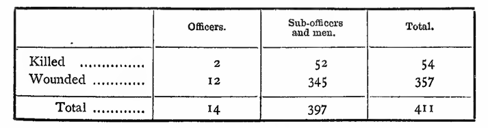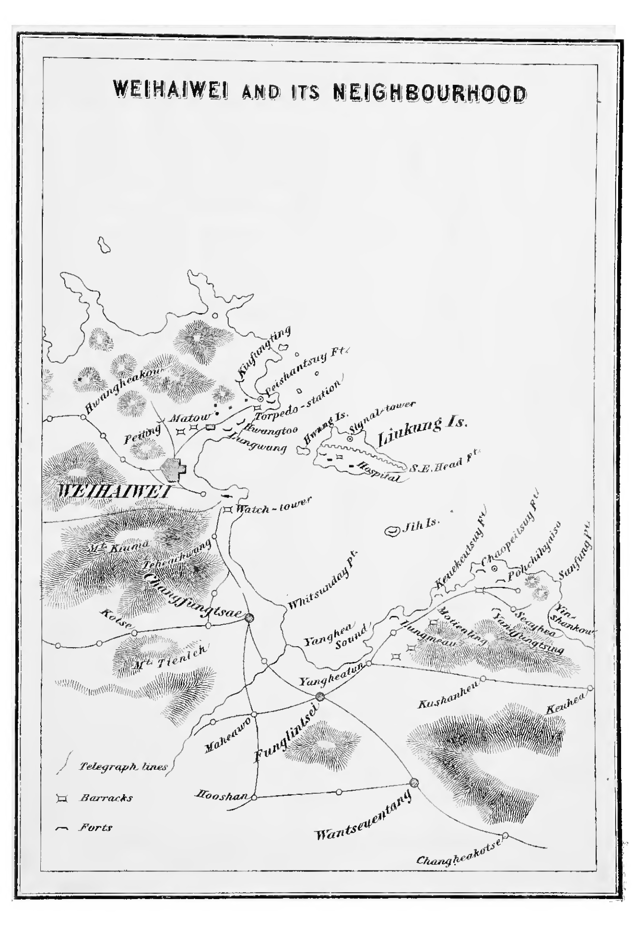 This corps was sent out as a portion of the Second Army Corps under Marshal Count Oyama. Preparations having been completed on the 25th, the army left Yungching, on the 26th, in two columns; the right (the Sixth Division) and the left (the Second Division), the former of which arrived by a northerly road from Yungching at Paouhea on the 29th, and the latter by a southerly road at a point to the southeast of Tseenting-tsesae, while the Staff Headquarters were at Menghea-chwangu. On the following day, an attack was to be made on the littoral forts, by the fleet and the Sixth Division, while the Second Division was to keep the enemy in check near Funglintsae. There had been skirmishes between the advance-guards and the Chinese, but nothing of a serious nature. The object of the Sixth Division was to take possession of the hills lying to the northeast of Kushanheu and thence to capture the coast forts. This was absolutely necessary for maintaining communication with the navy. The Division was divided into two wings, the left under Major-General Odera, consisting mainly of three Infantry battalions, and the right, under Major Watanabe, of a battalion, while Lieut.-General Kuroki held as reserve two battalions, with other arms. The Division left its quarters at 2 a.m., and the first object of attack was Motienling, the highest peak of a range of hills, on which a fort had been built. After a severe conflict, it was taken by assault, the Japanese charging up the hill on three sides. The Japanese Artillery corps at once entered the fort and began to fire the guns against other forts. The coast forts then turned their guns upon the captured fort and attacked it, with the assistance of several Chinese men-of-war. The Motienling fort was severely handled especially as the coast defence guns were far superior to its own. Meanwhile, a battalion of the left wing pursued the Chinese from Motienling and cut off their retreat. Even those in the coast forts showed a disposition to retreat before the Japanese took possession of all the roads. Taking advantage of this, the Japanese attacked and captured in succession the coast forts at Lung-meaoutsuy and Lukeutsuy, and the landward at Yangfungling. Now the only forts that were not taken in Pohchihyaisu were at Chaopeitsuy and Seayheasu, but their fall was only a question of time as they were entirely cut offby the Japanese. The Japanese began to attack them from the captured forts. The Seayheasu fort soon caught fire, and was destroyed; but the other still remained obstinate. Presently. 300 Chinese marines landed, and the garrison of the Chaopeitsuy fort set fire to the fort and joining these marines, tried to cut their way through the Japanese lines. They were almost all killed or driven into the sea. Thus the whole of the eastern forts of Wei-hai-wei fell into Japanese hands. The total strength of garrisons at these forts has been estimated at 2,600, of whom over 800 were killed or wounded. The Japanese lost about 115 in killed and wounded. Among these was Major-General Odera, Commander of the Eleventh Brigade, who was so severely wounded by a shell while in the Motienling fort that he died soon after. A newspaper correspondent was also killed. The whole of the next day was spent in making preparations for the attack on Wei-hai-wei itself on the morrow. The Sixth Division remained that day at Pohchihyaisu, and the Staff Headquarters at Wantseuentang, while the Second Division, which was principally charged with the task of attacking the naval port, was stationed at or near Funglintsae. The right column, in the meanwhile, had met on the 29th about 500 Chinese at Wantseuentang, which, however, it occupied with the loss of one killed and two wounded, The right wing, consisting of the Third Brigade, was led by Major-General Yamaguchi, while the left, consisting of the Fourth Brigade, was under Prince Fushimi. Early on the 30th, the advance guard of the left wing was attacked by the Chinese near Lwankochwang, and were hard-pressed as the latter were on a higher ground ; but the mountain artillery aided them so effectually that the enemy were put to flight. As Chinese troops were next seen fleeing from Yangheatun westward, the advance-guard advanced to attack them; hut they were so exposed to the fire of the men-of-war in the harbour that they were compelled to retire to Fungheawo. The Japanese lost two men killed and four wounded. The right wing took possession of the positions about Funglintsae. The Sixteenth Regiment was attacked by the Chinese who were fleeing to Wei-hai-wei from Pohchihyaisu. They had a sharp fight in which the Chinese men-of-war and torpedo-boats took part. The Chinese were, however, repulsed. Out of 2,000 who were flying towards Wei-hai-wei, 700 had attacked the regiment} and of these about 130 were killed. The Japanese losses were an officer wounded, and 38 sub-officers and men killed and 50 more wounded. After a day of preparation, the Second Division advanced on the 1st February to Lootaokow, about 12 miles south-west of Wei-hai-wei. On scouts reporting that there were 2,500 Chinese on the road to Wei-hai-wei, Prince Fushimi was sent with a regiment to attack them. In spite of a heavy snow-fall, the Chinese were completely routed, the Japanese losing 5 killed and 35 wounded. The Division slowly advanced, routing the Chinese concealed about the hills, and on the 2nd, the Fourth Brigade entered Wei-hai-wei without meeting with much resistance. Now only the island forts remained in the possession of the Chinese. Their capture as well as that of the Chinese men-of-war was the duty of the Japanese Navy, whose movements may be briefly summarised as follows:— After sending the first flying squadron to fire a few shots 011 the 19th at Tangchow to divert the attention of the Chinese at Wei-hai-wei, the Japanese fleet convoyed the transports to Yungching Bay, and though the troops had been entirely landed by the 24th, remained at the Bay unti