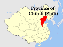 southern portion of the Province of Chih-li (Zhili, alternately romanized as Chihli, was a northern administrative region of China since the 14th-century that lasted through the Ming dynasty and Qing dynasty until 1911, when the region was dissolved, converted to a province, and renamed Hebei in 1928.), Shan-si, and Shen-si ( Shaanxi) the northern portions of Honan and