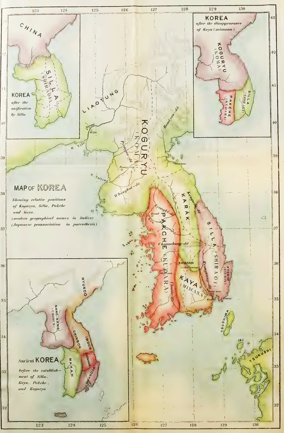 In the north, Koguryn was established in BC 37, and lasted down to 668 AD. This is the State which appears as Koma in the Japanese