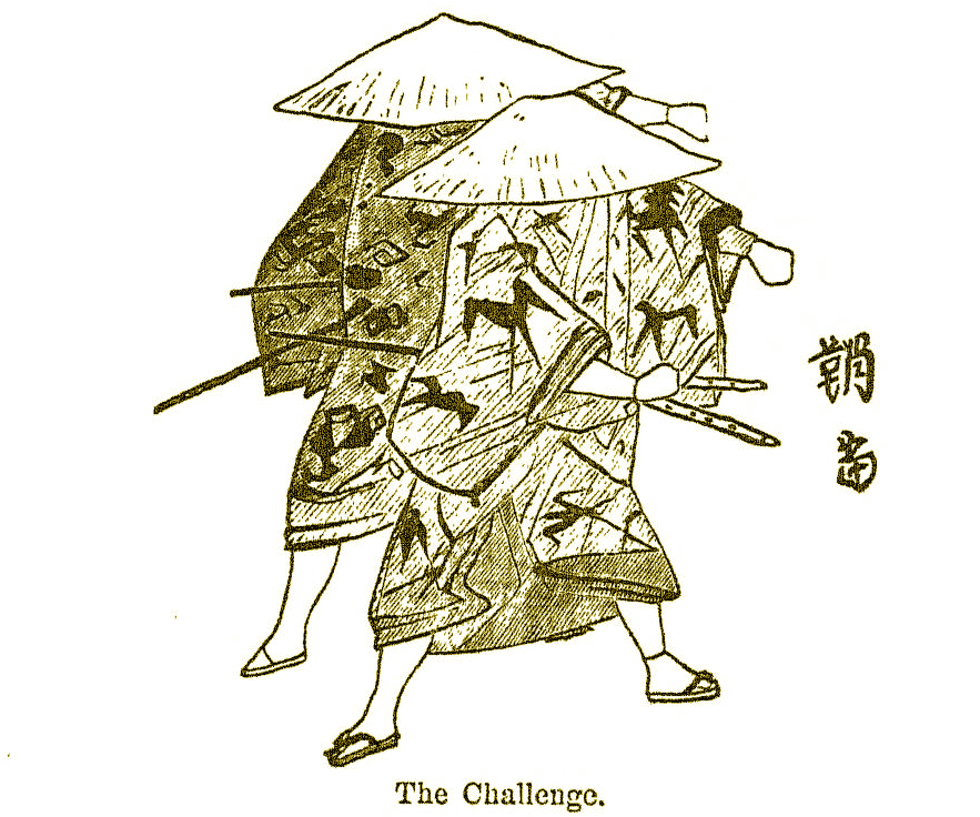 The rations of the soldiers were rice, fish, and vegetables. Instead of tents, huts of straw or boughs were easily erected to form a camp. The general's head -quarters were inclosed by canvas, stretched on posts six feet high, on which his armorial bearings were wrought. The weapons were bows and arrows, spear, sword, and, rarely, battle-axes and bow-guns; for sieges, fire-arrows. The general's scabbard was of tiger-skin. Supplies of this material were obtained from Corea, where the animal abounds. His baton was a small lacquered wand, with a cluster of strips of thick white paper dependent from the point. Flags, banners, and streamers were freely used; and a camp, castle, or moving army, in time of war, with its hundreds and thousands of flags, presented a gay and lively appearance. Drums, hard-wood clappers, and conch-shells sounded the reveille, the alarm, the onset, or the re- treat. Owing to the nature of the ground, consisting chiefly of mountains and valleys, or plains covered with rice-swamps intersected by narrow paths, infantry were usually depended upon. In besieging a castle, the intrenchments of the investing army consisted chiefly of a line of palisades or heavy planks, propped up from within by hinged supports, at an angle of forty-five degrees, behind which the besiegers fought or lived in camp life, while sentinels paced at the gates. Lookouts were posted on overlooking hills, in trees, or in towers erected for the purpose. Sometimes huge kites able to sustain a man were flown, and a bird's-eye view of the interior of the enemy's castle thus obtained. Fire, treachery, stratagem, starvation, or shooting at long range having failed to compel surrender, an assault took place, in which the gates were smashed in, or the walls scaled. Usually great loss resulted before the besiegers were driven off, or were victorious. Rough surgery awaited the wounded. An arrow-barb was usually pulled out by a jerk of the pincers. A sabre-cut was sewed or bound together with tough paper, of which every soldier carried a supply. The wonderfully adhesive, absorptive, and healing power of the soft, tough, quickly wet, easily hardening, or easily kept pliable, Japanese paper made excellent plasters, bandages, tourniquets, cords, and towels. In the dressing of wounds, the native doctors to this day, as I have often had occasion to witness, excel. Seppuku (belly-cut) or hara-kiri also came into vogue about the time of the beginning of the domination of the military classes. At first, after a battle, the vanquished wounded fell on their swords, drove them through their mouth or breast, or cut their throats. Often a famous soldier, before dying, would flay and score his own face beyond recognition, so that his enemies might not glory over him. This grew into a principle of honor; and frequently the unscathed survivors, defeated, and feeling the cause hopfeless, or retainers whose master was slain, committed suicide. Hence arose, in the Ashikaga period, the fashion of wearing two swords; one of which, the longer, was for enemies; the other, shorter, for the wearer's own body. The practice of hara-kiri as a judicial sentence and punishment did not come into vogue until in the time of the Tokugawas. Thrust into a tiny scabbard at the side of the dirk, or small sword, was a pair of chopsticks to eat with in camp. Anciently these were skewers, to thrust through the top-knot of a decapitated enemy, that the head might be easily carried. Besides, or in lieu of them, was a small miniature sword, ko-katana (little sword), or long, narrow knife. Although this was put to various trivial uses, such as those for which we employ a penknife, yet its primary purpose was that of the card of the owner. Each sword was adorned with some symbol or crest, which served to mark the clan, family, or person of the owner. The Satsuma men wore swords with red-lacquered scabbards. Later, the Tokugawa vassals, who fought in the battle of Sekigahara, were called "white hilts," because they wore swords of extraordinary length, with white hilts. The bat, the falcon, the dragon, lion, tiger, owl, and hawk, were among the most common designs wrought in gold, lacquer, carving, or alloy on the hilts, handles, or scabbard; and on the ko-katana was engraved the name of the owner. Feudalism was the mother of brawls innumerable, and feuds between families and clans continually existed. The wife whose husband was slain by the grudge-bearer brought up her sons religiously to avenge their father's death. The vendetta was unhindered by law and applauded by society. The moment of revenge selected was usually that of the victim's proudest triumph. After promotion to office, succession to patrimony, or at his marriage ceremony, the sword of the avenger did its bloody work. Many a bride found herself a widow on her wedding-night. Many a child became an orphan in the hour of the father's acme of honor. When the murder was secret, at night, or on the wayside, the head was cut off, and the avenger, plucking out his ko-katana thrust it in the ear of the victim, and let it lie on the public highway, or sent it to be deposited before the gate of the house. The ko-katana, with the name engraved on it, told the whole story. Whenever the lord of a clan wished his rival or enemy out of the way, he gave the order of Herodias to her daughter to his faithful retainers, and usually the head in due time was brought before him, as was John's, on a charger or ceremonial stand. The most minutely detailed etiquette presided over the sword, the badge of the gentleman. The visitor whose means allowed him to be accompanied by a servant always left his long sword in his charge when entering a friend's house; the salutation being repeated bowing of the forehead to the floor while on the hands and knees, the breath being sucked in at the same time with an impressive sound. The degree of obeisance was accurately graded according to rank. If alone, the visitor laid his sword