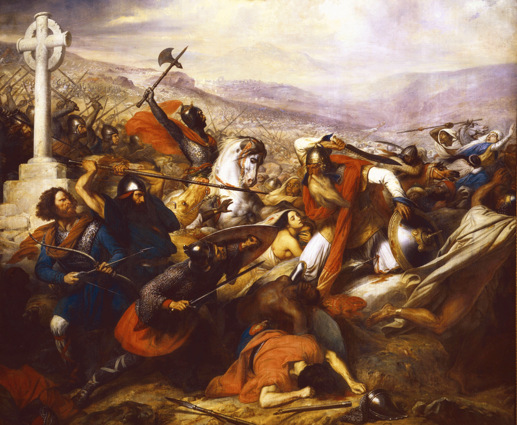 “At the death of Mohammed, in 632, his temporal and religious sovereignty embraced and was limited by the Arabian peninsula. The Roman and Persian empires, engaged in tedious and indecisive hostility upon the rivers of Mesopotamia and the Armenian mountains, were viewed by the ambitious fanatics of his creed as their quarry. In the very first year of Mohammed’s immediate successor, Abubeker, each of these mighty empires was invaded. The crumbling fabric of Eastern despotism is never secured against rapid and total subversion; a few victories, a few sieges, carried the Arabian arms from the Tigris to the Oxus, and overthrew, with the Sassanian dynasty, the ancient and famous religion they had professed. Seven years of active and unceasing warfare sufficed to subjugate the rich province of Syria, though defended by numerous armies and fortified cities; and the Khalif Omar had scarcely returned thanks for the accomplishment of this conquest, when Amrou, his lieutenant, announced to him the entire reduction of Egypt. After some interval, the Saracens won their way along the coast of Africa, as far as the pillars of Hercules, and a third province was irretrievably tom from the Greek empire. These western conquests introduced them to fresh enemies, and ushered in more splendid successes. Encouraged by the disunion of the Visigoths, and invited by treachery, Musa, the general of a master who sat beyond the opposite extremity of the Mediterranean Sea, passed over into Spain, and within about two years the name of Mohammed was invoked under the Pyrenees.”—Hallam.