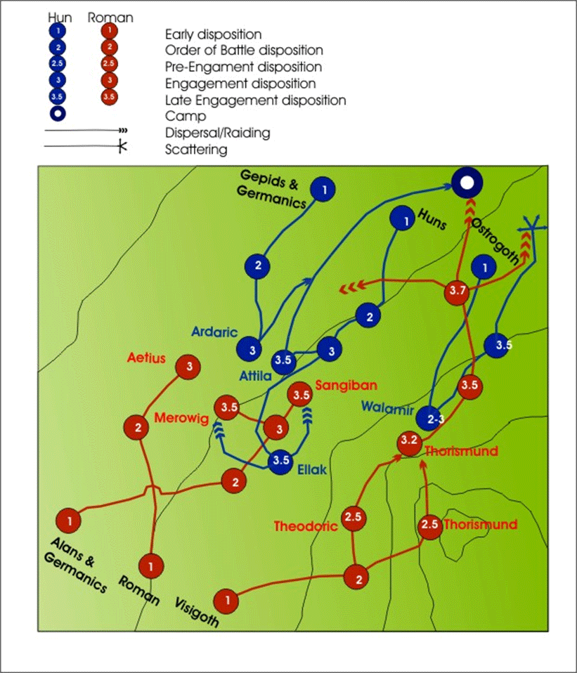 THE BATTLE OF CHALONS, 451. A.D. 43. The Romans commence the conquest of Britain, Claudius being then emperor of Rome. The population of this island was then Celtic. In about forty years all the tribes south of the Clyde were subdued, and their land made a Roman province. 58—60. Successful campaigns of the Roman general Corbulo against the Parthians. 66. First persecution of the Christians at Rome under Nero. 68—70. Civil wars in the Roman world. The emperors Nero, Galba, Otlio, and Vitelius, cut off successively by violent deaths. Vespasian becomes emperor. 70. Jerusalem destroyed by the Romans under Titus. 83. Futile attack of Domitian on the Germans. 86. Beginning of the wars between the Romans and the Dacians. 98—117. Trajan, emperor of Rome. Under him the empire acquires its greatest territorial extent by his conquests in Dacia and in the East. His successor, Hadrian, abandons the provinces beyond the Euphrates, which Trajan had conquered. 138—180. Era of the Antonines. 167—176. A long and desperate war between Rome, and a great confederacy of the German nations. Marcus Antoninus at last succeeds in repelling them. 192—197. Civil wars throughout the Roman world. Severus becomes emperor. He relaxes the discipline of the soldiers. After his death in 211, the series of military insurrections, civil wars, and murders of emperors recommences. 226. Artaxerxes (Ardishcer) overthrows the Parthian, and restores the Persian kingdom in Asia. He attacks the Roman possessions in the East. 250. The Goths invade the Roman provinces. The emperor Decius is defeated and slain by them. 253—260. The Franks and Alemanni invade Gaul, Spain, and Africa. The Goths attack Asia Minor and Greece. The Persians conquer Armenia. Their king, Sapor, defeats the Roman emperor Valerian, and takes him prisoner. General distress of the Roman empire. 268—283. The emperors Claudius, Aurelian, Tacitus, Probus, and Carus defeat the various enemies of Rome, and restore order in the Roman state. 285. Diocletian divides and re-organises the Roman Empire. After his abdication in 305 a fresh series of civil wars and confusion ensues. Constantine, the first Christian emperor, reunites the empire in 324. 330. Constantine makes Constantinople the seat of empire instead of Rome. 363, The emperor Julian is killed in action against the Persians. 364—375. The empire is again divided, Valentinian being emperor of the West, and Valens of the East. Valentinian repulses the Alemanni, and other German invaders from Gaul. Splendour of the Gothic kingdom under Hermanrie, noith of the Danube. 375—395. The Huns attack the Goths, who implore the protection of the Roman emperor of the East. The Goths are allowed to pass the Danube, and to settle in the Roman provinces. A war soon breaks out between them and the Romans, and the emperor Valens and his army are destroyed by them. They ravage the Roman territories. The emperor Theodosius reduces them to submission. They retain settlements in Thrace aud Asia Minor. 395. Final division of the Roman empire between Arcadius and Honorius, the two sons of Thebdosius. The Goths revolt, and under Alaric attack various parts of both the Roman empires. 410. Alaric takes the city of Rome. 412. The Goths march into Gaul, and in 414 into Spain, which had been already invaded by hosts of Vandals, Suevi, Alani, and other Germanic nations. Britain is formally abandoned by the Roman emperor of the West. 428. Genseric, king of the Vandals, conquers the Roman province of North Africa. 441. The Huns attack the Eastern empire. A.D. 476. The Roman Empire of the West extinguished by Odoacer.