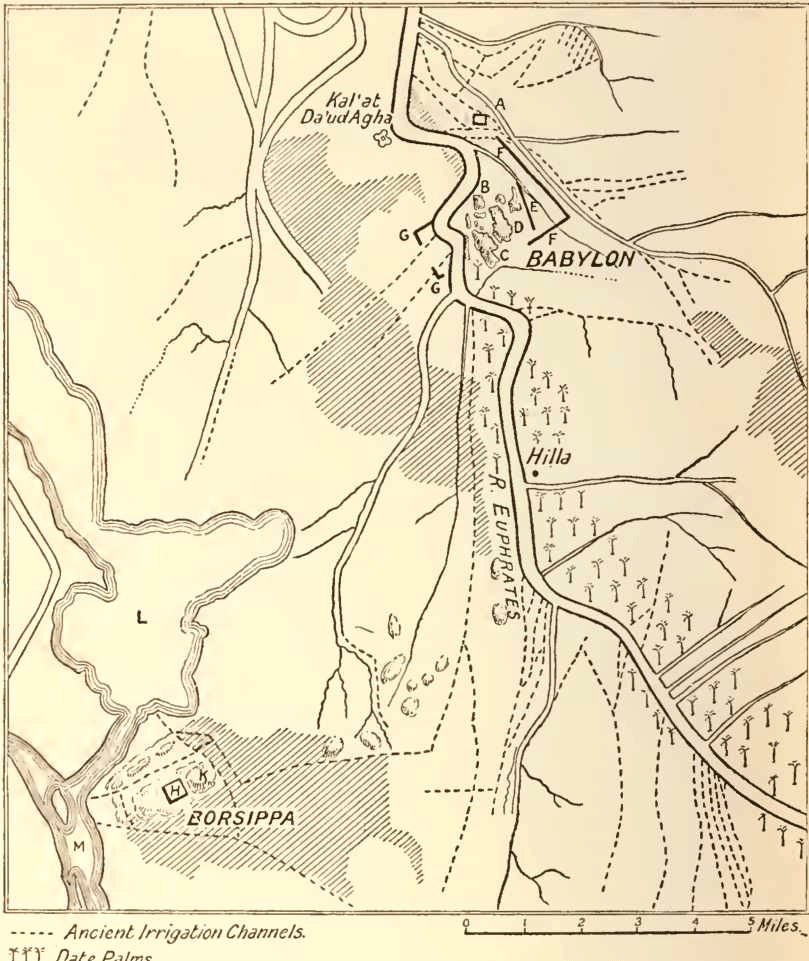 As a matter of fact part of the great wall, which surrounded the city from the Neo-Babylonian period onward, has survived to the present day, and may still be recognized in a low ridge of earth, or series of consecutive mounds, which cross the plain for a considerable distance to the south-east of Babil. The traveller from Baghdad, after crossing the present Nil Canal
