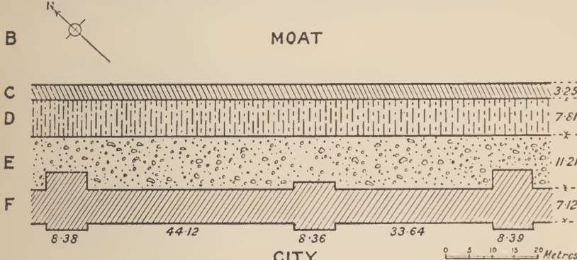 the city-wall, along the north-east side, may still be traced by the position of these low earthen mounds, and they