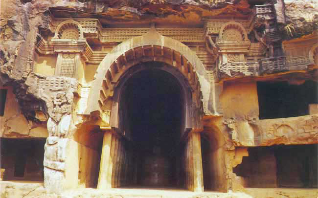 Wherever important stupas like those described above (Sanchi) were erected, monasteries were also provided for the accommodation of the monks or nuns residing on the spot, and chapels or chaitya halls in which they could assemble for their devotions. The monasteries, as might be expected, were designed on the same plan as private houses: that is, with an open square courtyard in the centre surrounded on the four sides by a range of cells. Perhaps the earliest existing example of such a monastery is one by the side of the Piprahwa stupa, which is said to be built of bricks of much the same size and fabric as those employed in the stupa itself. As a rule, however, the early architects built their structural monasteries and chaitya halls either wholly of wood or with a superstructure of wood set on a stylobate of stone, like the more primitive temples of Greece; and it was not until about the first century BC that more durable materials came into vogue for pillars and walls, and not until a still later period that they came to be used for entablature and roofs. The chaitya halls were remarkably similar in plan to the early Christian basilicas, being divided by two rows of columns into a nave and two narrow side aisles, which were continued round the apse. The only remains of such structural halls prior to the Christian era are those at Sanchi and Sonari in the Bhopal State of Central India. In both cases the superstructure seems to have been of wood, and what now survives of the original hall consists only of a lofty stone plinth approached by flights of steps, but the form of the plinth and the plan of the interior foundations leave no doubt that the superstructure must have been similar in design to the rock-hewn chaitya halls of Western India. While these structural edifices stupas, chapels, and monasteries were being erected in Hindustan, the Buddhists and Jains of Western and Eastern India were engaged in fashioning more permanent monuments of the same class by hewing them from the living rock. The practice of hollowing out chambers had been common in Egypt from time immemorial, and by the sixth century BC had spread as far east as Persia, where the royal tombs of Darius and his successors of the Achaemenian dynasty up to the time of Codomannus (335-330 BC) were excavated in the cliffs of Naksh-i-Rustam and Persepolis. Chaityas From Persia the idea found its way during the third century before our era into Hindustan and resulted, as we have already seen, in the excavation of dwelling places and chapels for ascetics in the Barabar hills of Bihar. These artificial caves of the Maurya period were of very modest proportions, and were at first kept severely plain, or, like their Iranian prototypes, adorned only on the outer façade. As time went on, however, the Indian excavators became more ambitious and, rapidly expanding their ideas,proceeded to copy their structural chaitya halls and viharas on the same scale as the originals, and to imitate their details with an accuracy which says more for their industry and patience than for the originality of their genius. So literal, indeed, was the translation of wooden architecture into the new and more durable material, that infinite toil was expended in perpetuating forms which became quite meaningless and inappropriate when applied to stone. Thus, in wooden structures there had been valid enough reason for inclining pillars and door jambs inwards, in order to counteract the outward thrust of the curvilinear roof, but, reproduced in stone, this inclination entirely missed its purpose and served only to weaken instead of strengthening the supports. Again, it was mere waste of labour to copy roof timbers; still greater waste was it, first to cut away the rock and then insert such timbers in wood, as was done in some of the earlier caves. This close imitation of wooden construction affords a useful criterion for determining the relative ages of these rock-hewn monuments, since it is logical to infer that the older the cave, the nearer it is likely to approximate to its wooden prototypes. But this index of age must not be pressed too far; for, though the rule generally holds good, there are many exceptions to it, and in every case, therefore, careful account must be taken of other features also, and especially of the plastic treatment of the sculptures and decorative ornaments which are found in many of the caves. Among the earlier chaitya halls of Western India the finest examples are those at Bhaja, Kondane, Pitalkhora, Ajanta, Bedsa, Nasik, and Karli. The plan and general design of these halls is approximately the same, and the description of one will suffice for all.