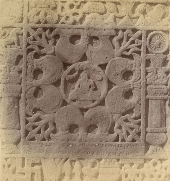 The inscriptions carved here and there on the gateways record the names of pious individuals or of gilds who contributed to their erection, but say not a word, unfortunately, of the scenes and figures delineated, the interpretation of which has been rendered all the more difficult by the practice, universal in the Early School, of never portraying the Buddha in bodily form, but of indicating his presence merely by some symbol, such as his footprints or the throne on which he sat or the sacred tree associated with his enlightenment. Thanks, however, to the light afforded by the sculptures of Bharhut, with their clear, explicit titles, and thanks, also, to the brilliant labours of Mons. A. Foucher and Prof, Grünwedel, the interpretation of the majority of these reliefs has now been placed beyond dispute, and it will probably not be long before the meaning of the rest becomes equally clear. A good illustration of the methods of narration followed by the artists and of what has been achieved towards the interpretation of the sculptures, is afforded by the front façade of the East Gateway. On the right pillar are represented, in six panels, the six devalokas or stages of the Buddhist Paradise, their respective deities seated like mortal kings in each. On the left, starting from the base, is Bimbisara with his royal cortege issuing from the city of Rajagriha on a visit to the Buddha, here symbolised by his empty throne. This visit took place after the conversion of Kashyapa, and in the panel above is depicted one of the miracles by which Buddha converted the Brahman ascetic. The Nairanjana river is shown in flood, with Kashyapa and two of his disciples hastening in a boat to the rescue of Buddha. Then, in the lower part of the picture, Buddha, represented again by his throne, appears walking on the face of the waters, and in the fore-ground the figures of Kashyapa and his disciples are repeated, now on dry ground and doing homage to the Master. The third panel portrays the temple at Buddh Gaya, built by Ashoka, with the throne of Buddha within, and, spreading through its upper windows, the branches of the sacred tree. It is the illumination of Buddha; and to right and left of the temple are four figures in an attitude of prayer perhaps the Guardian Kings of the four quarters; while ranged above in two tiers are groups of deities looking on in adoration from their celestial paradises. The scenes on the lintels are still more elaborate. On the lowest we see, in the centre, the temple and tree of Buddh Gaya; to the left, a crowd of musicians and devotees with water vessels; to the right, a royal retinue and a king and queen descending from an elephant, and afterwards doing worship at the tree. This is the ceremonial visit which Ashoka and his queen, Tishyarakshita, paid to the Bodhi-tree, for the purpose of watering it and restoring its pristine beauty after the evil spell which the queen had cast upon it. The middle lintel is occupied with the scene of Buddha's departure from Kapilavastu. To the left is the city with wall and moat, and, issuing from its gate, the horse Kanthaka, his hoofs supported by Yakshas and accompanied by the divinities in attendance on the Buddha, and by Chhandaka, his groom, who holds the umbrella symbolical of his Master's presence. In order to indicate the progress of the Prince, this group is repeated four times in succession towards the right of the relief, and then, at the parting of the ways, we see Chhandaka and the horse sent back to Kapilavastu, and the further journey of Buddha indicated by his footprints surmounted by the umbrella. Lastly, in the topmost lintel, are representations of the seven last Buddhas, the first and last symbolised by thrones beneath their appropriate Bodhi-trees, the rest by the stupas which enshrined their relics.