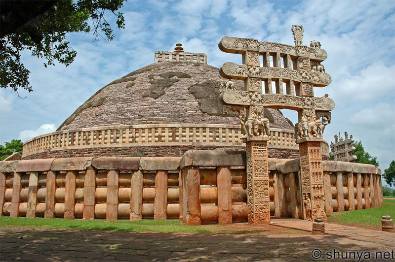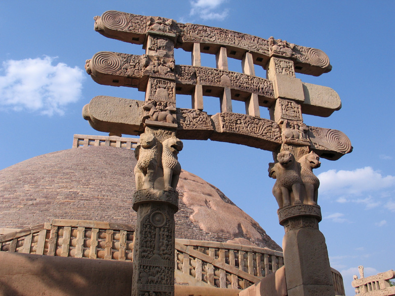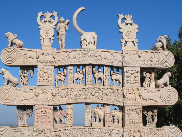 To revert, however, to the gateways of the Great stupa, in which the interest of Sanchi mainly resides. The earliest of them to be erected was the one at the south entrance, opposite to the steps by which the berm was approached; then followed, in chronological order, the northern, the eastern, and the western, theirsuccession in each case being demonstrated by the style of their carvings and by the tectonic character of the extensions to the rail, which were made at the time that each was set up. All four gateways are of similar design - the work of carpenters rather than of masons - and the marvel is that erections of this kind, constructed on principles wholly unsuited to work in stone, have survived in such remarkable preservation for nearly two thousand years. Interpretation of Reliefs Each gateway was composed of two square pillars surmounted by capitals, which in their turn supported a superstructure of three architraves with volute ends, ranged one above the other at intervals slightly in excess of their own height. The capitals were adorned with standing dwarfs or with the forefronts of lions or elephants set back to back in the Persepolitan fashion; and, springing from the same abacus and acting as supports to the projecting ends of the lowest architrave, were Caryatid figures of graceful and pleasing outline. Other images of men and women, For the rest, both pillars and superstructure were elaborately enriched with bas-reliefs illustrative of the Jataka legends or scenes from the life of the Buddha or important events in the subsequent history of the Buddhist religion. Besides which, there were representations of the sacred trees and stupas symbolical of Shakyamuni and the preceding Buddhas; of real or fabulous beasts and birds; and many heraldic and floral devices of rich and varied conception.