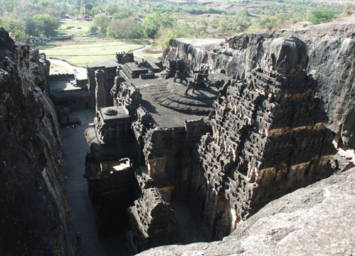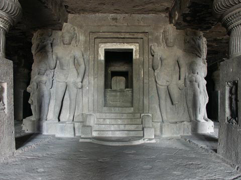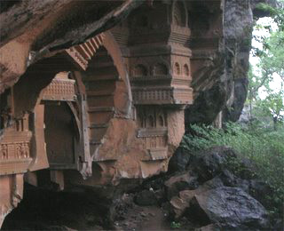 At Bhaja, Kondane, Pitalkhora, and the earliest at Ajanta, the screen which closed the entrance to the hall was originally of wood, and in all these caves, as well as in those of Bedsa and Nasik, the pillars incline inwards to a greater or less degree. In the Ajanta hall, again, the pillars are quite plain without base or capital, and here, as at Pitalkhora, the coved ceiling of the side aisles is adorned with coffers, the ribs between which are carved from the rock, not framed in wood.