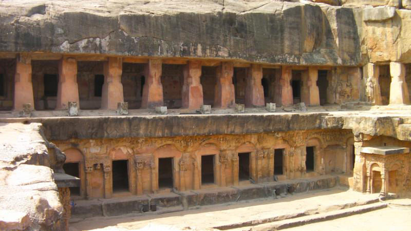 The composition of these sculptures is strangely bizarre and fanciful, and their style, generally, is not of a high order; but it is easy to perceive from the technique of the relief work, from the freedom of the composition and of the individual poses, as well as from the treatment of the ornaments, that they are to be classed among the later efforts of the Early School, not among its primitive productions. Their date certainly cannot be much earlier than the middle of the last century before the Christian era. The Caves of Orissa Of the early caves along the East Coast the only ones that merit attention here are the two neighbouring and intimately connected groups on the hills of Udayagiri and Khandagiri in Orissa. Unlike the rock-hewn monuments of Western India described above, which were the handiwork of Buddhists, these Orissan caves were both excavated and for many years tenanted by adherents of the Jain religion, who have left behind them unmistakable evidences of their faith both in the early inscribed records and in the medieval cult statues which are found in several of the caves. To this sectarian difference is due many distinctive features of the architecture, including, among others, the entire absence of chaitya halls, for which, apparently, there was no need in the ceremonial observances of the Jains. Taken together, the two groups comprise more than thirty-five excavations, of which the more remarkable in point of size and decoration are the Ananta Gumpha on Khandagiri, and the Rani Gumpha, Ganesh Gumpha, and the Jayavijaya caves on the Udayagiri hill.