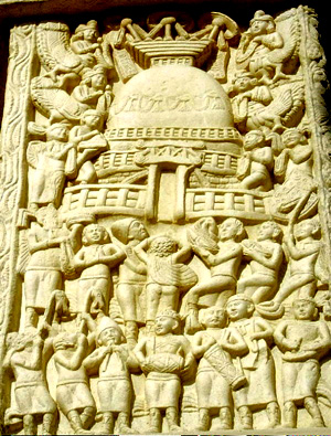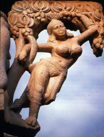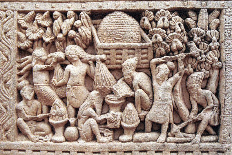 While the Sarnath capital is thus an exotic, alien to Indian ideas in expression and in execution, the statue of Parkham falls naturally into line with other products of indigenous art and affords a valuable starting point for the study of its evolution. These two works represent the alpha and the omega of early Indian art, between which all the sculptures known to us take their place, approximating to the one or the other extreme according as the Indian or Perso-Hellenic spirit prevailed in them. Thus, the two statues from Patna in the Calcutta Museum are akin in many respects to the Parkham image, but exhibit a nearer approach to plurifaciality in the moulding of the torso. The lion capital at Sanchi, on the other hand, though not quite as successful as that of Sarnath, shows so close an affinity to it, that there can be little doubt that it was the handiwork of one and the same artist; and the well-developed modelling of the figures on the other columns of Ashoka shows that, in spite of their occasionally inferior execution, they belong to the same Perso-Hellenistic group. It is not, of course, to be presumed that a single sculptor was responsible for all these monuments, nor yet that all the sculptors employed were of equal ability. Probably, there were many Indians assisting the foreign artists in the mechanical part of their work, and these, we may believe, were responsible for some of the sculptures noticed above, but it is incredible that any Indian hand at this period should either have modelled in clay or chiselled from the stone such perfected forms as those of the Sarnath capital. Jewellers and Lapidaries' Arts The contrast between Indian and foreign workmanship exhibited by these sculptures is equally apparent in the minor arts of the Maurya period. Thus, the indigenous coins known commonly as 'punch-marked', which were current at this time, are singularly crude and ugly, neither their form, which is unsymmetrical, nor the symbols, which are stamped almost indiscriminately upon their surface, having any pretensions to artistic merit. On the other hand, the coins of Sophytes (Saubhuti), who was reigning in the Punjab at the close of the fourth century BC, are purely Greek in style, having seemingly been copied from an issue of Seleucus Nicator, with whom Sophytes probably came into contact when the former invaded the Punjab in 305 BC. It is the same, also, with the contemporary terracottas. Side by side with products of Perso-Hellenic art, the features of which are markedly classical in character, is found a class of coarse primitive reliefs, the execution of which betrays their Indian origin, though in a few cases, the type of the winged figure depicted on them is derived from Persian or Mesopotamian prototypes. Indeed, so far as is known at present, it was only in the jewellers and lapidaries arts that the Maurya craftsman attained any real proficiency, and in this domain his aptitude lay, not in the plastic treatment of form, but in the high technical skill with which he cut and polished refractory stones or applied delicate filigree or granular designs to metal objects. The refined quality of his gold and silver work is well illustrated in two pieces discovered on the site of Taxila in company with a gold coin of Diodotus, a large number of local punch-marked coins, and a quantity of other jewellery and precious stones. Of the stonecutter's art, also, some beautiful examples are furnished by the relic caskets of beryl and rock crystal from the stupas of Bhattiprolu and Piprahwa, the latter of which is probably to be assigned to this epoch. The art of the jeweller has at all times appealed strongly to the Indian genius, and throughout Indian history has exercised a deep influence upon the national sculpture and painting, supplying them with a variety of rich and artistic motifs which were quickly and cleverly adapted for purposes of decorative design, but at the same time inclining the ideas of the artists towards meticulous detail and thus obstructing a free, bold, anatomical treatment of the human figure. With the rise of the Shunga power in Hindustan during the second century BC and the simultaneous extension of the Bactrian dominion to the Punjab, the national art of India underwent a rapid development. Foreign and especially Hellenistic ideas now flowed eastward in an ever-increasing volume, and from them the Indian artist drew new vitality and inspiration for his work. At the same time stone more and more usurped the place of wood for architectural purposes, and by reason of its greater durability tempted the artist to expend more pains upon its carving, while it naturally lent itself to more perfect technique. Bharhut: Besnagar Of the monuments of this period, the most notable is the Buddhist stupa at Bharhut in Central India, erected about the middle of the second century BC. Before its discovery by Sir A. Cunningham in 1873, the body of this stupa had been almost destroyed by the neighboring villagers, but portions of the eastern gateway and of the railings which encircled the monument were found beneath its ruins and are now deposited in the Calcutta Museum. The stupa itself was of brick, and apparently of much the same design as the Great stupa at Sanchi, described below. Around the base was a massive stone railing of the usual type, divided into four quadrants by entrances at the cardinal points, while other railings of smaller dimensions, of which fragments have been found around the structure, once flanked the berm and ascending stairway, and no doubt enclosed the crowning hti. At the eastern entrance was a gateway about 22 feet 6 inches in height, and possibly similar gateways may once have adorned the other entrances also, though no remains of them have been found. Both gateway and railings are lavishly enriched with sculptured reliefs, many of which illustrate incidents in the Jatakas or scenes connected with the life of the Buddha, and these illustrations