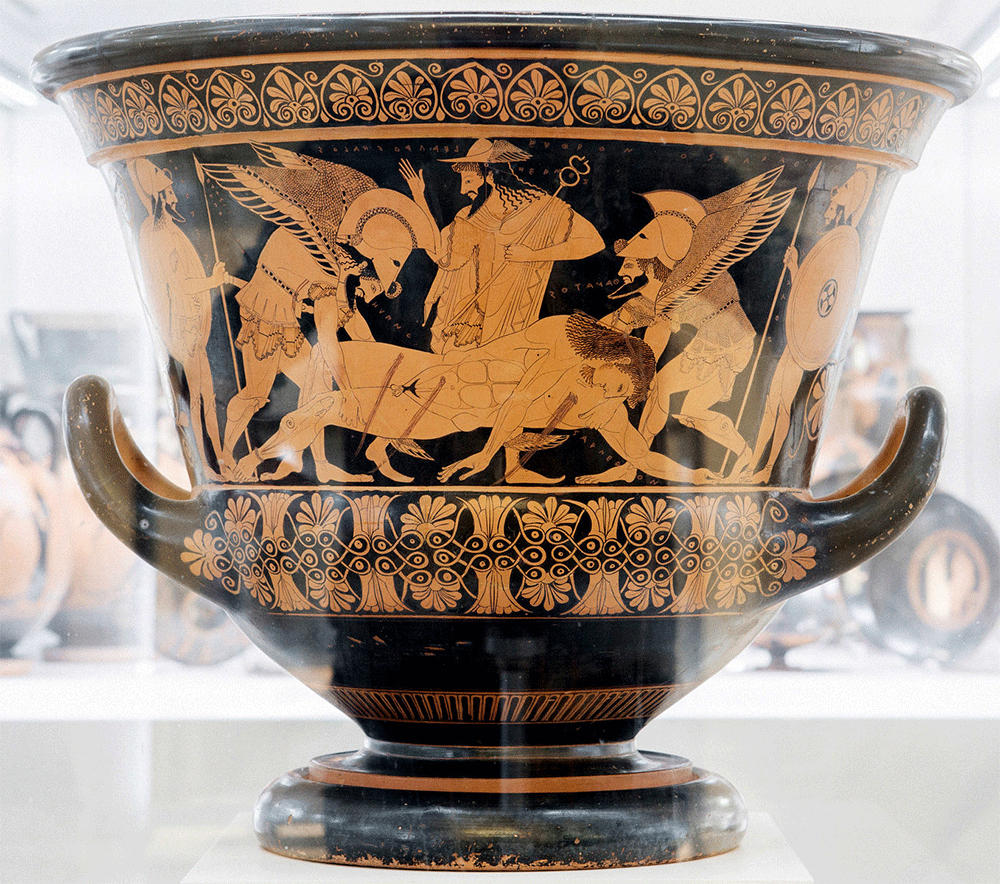 We have seen how in the course of the sixth century the Attic potters drove their competitors from the field. About 525, a new technique came in. The old black-figure method long survived, never quite died out, and produced masterpieces down to the end of the sixth century, but it waned gradually before the new red-figure method, in which the figures arce not painted in black on the clay of the vase, but left in the colour of the clay, and the background painted black: the minor details are in brown lines; a purplish-red is used very sparingly; and the colour-effect is thus very sober. That manly precision, which is one of the chief characteristics of Greek vase-painting, is now imparted not by incised lines as previously, but by the wiry unerring ‘relief-line’. In its relation to nature, the drawing of the earliest red-figure vases does not differ in essentials from that of the black-figured vases signed by Execias or Amasis. The great change sets in fully about ten years after the introduction of the red-figure technique. The characteristics of the new style are first, a profound interest in the individual forms of the human body, and second, a new conception of the body in space, a conception of which the most obvious manifestation is the love of certain violent yet definite foreshortenings.