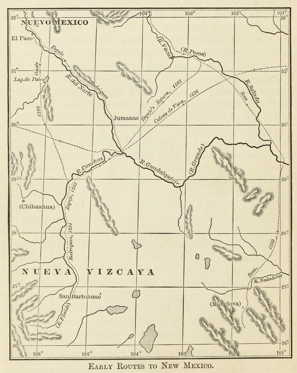 strong, set out from San Bartolomé on the 6th of June, 1581, and followed the Río Concha, or Conchos, down to its junction with a very