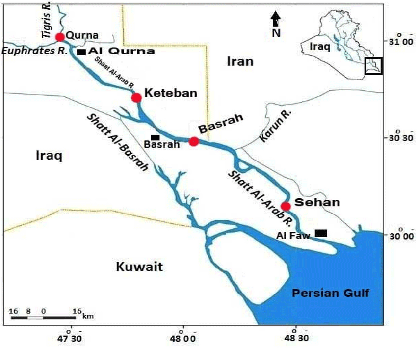 some 1200 miles from just south-east of the mouth of the Shatt el-Arab (Tigris-Euphrates)