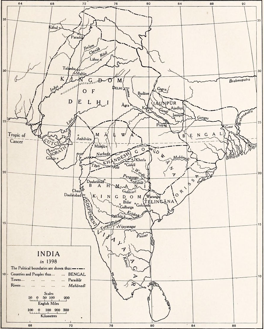 “The rule of the Lord of the World extends from Delhi to Palam”— a small town little more than nine miles south-west of the capital. Independent kingdoms had been established in Bengal and the Deccan before Muhammad's death, and the rebellion of the royal officers in the south had enabled the Hindus to found the great kingdom of Vijayanagar and had facilitated the establishment in Telingana of a Hindu state in subordinate alliance with the kingdom of the Deccan, not with Delhi. During the reigns of the feeble successors of Firuz the province of Oudh and the country to the east of the Ganges as far as the borders of Bengal were formed into the independent kingdom of Jaunpur; the great provinces of Gujarat and Malwa and the smaller province of Khandesh severed their connection with Delhi and became separate states; a Hindu principality was established in Gwalior and Muslim principalities in Bayana and Kalpi; the nominal allegiance of Mewat was transferred from one prince to another at the caprice of the local chieftain; the Hindus of the Doab were almost continually in revolt and the ruler of Delhi had to be content with the small contributions which he could extort from them by armed force when he was not otherwise engaged; and the ruin of the state was completed by the invasion of Timur, who established in the Punjab a power which eventually absorbed the kingdom of Delhi.