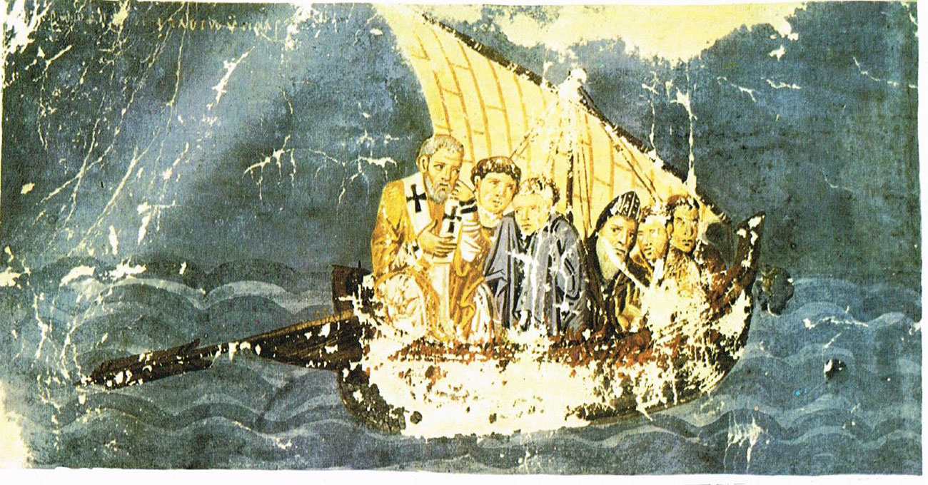Miniatura de un manuscrito del siglo IX que representa a un grupo de cristianos escapando por mar de la persecución de los arrianos (Biblioleca Nacional, Parts). La huida de la sociedad fue una solución que adoptaron con frecuencia los hombres de los primeros siglos para librarse de la justicia o de mayores molestias. Algunos cristianos huyeron al desierto en busca de mayor perfección. Anacoreta quiere decir, precisamente, "el que sube al desierto". |
