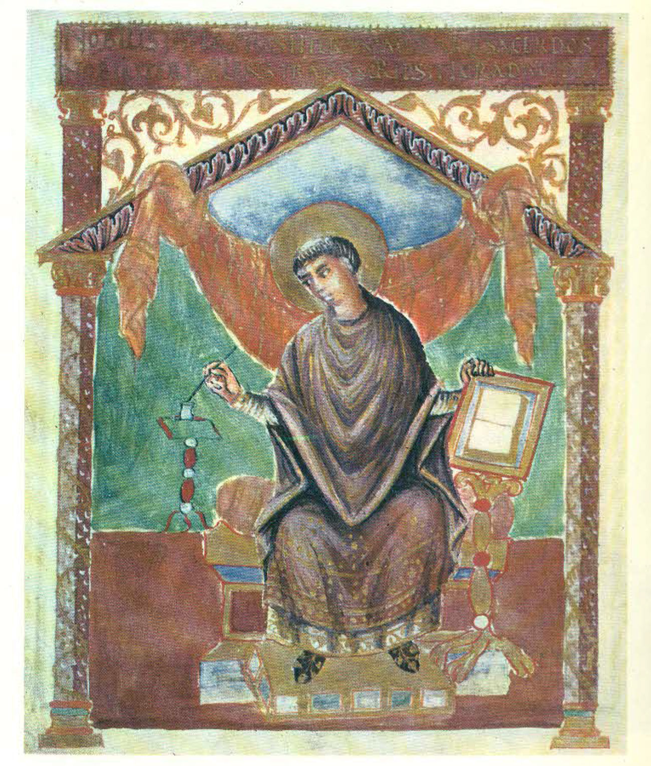 Miniatura del salterio de Carlos el Calvo, del siglo IX, que representa a San Jerónimo escribiendo (Biblioteca Nacional, París). Entre la producción literaria de San Jerónimo quedan muchas cartas personales de dirección espiritual, un tratado sobre los varones ilustres y la versión directa del hebreo al latín del Antiguo Testamento, texto de la Biblia Vulgata. |