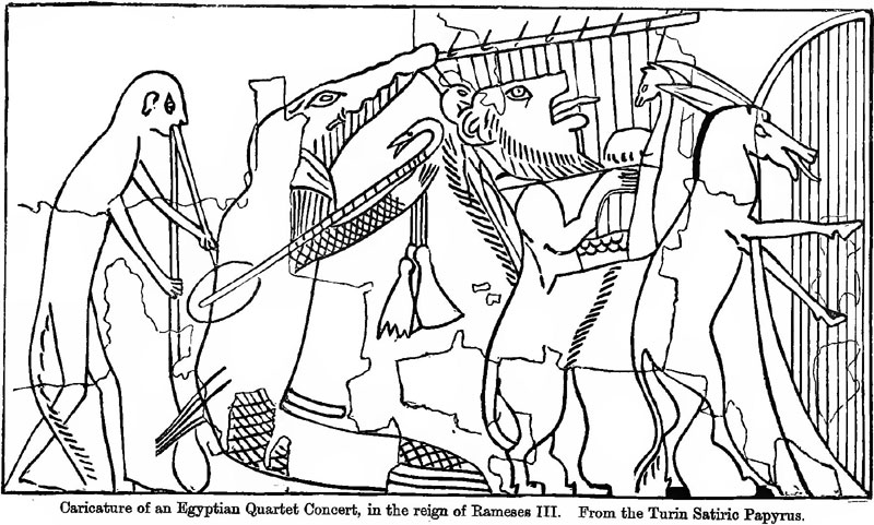 an Egyptian caricature of a quartet concert at the Court of Rameses III. The